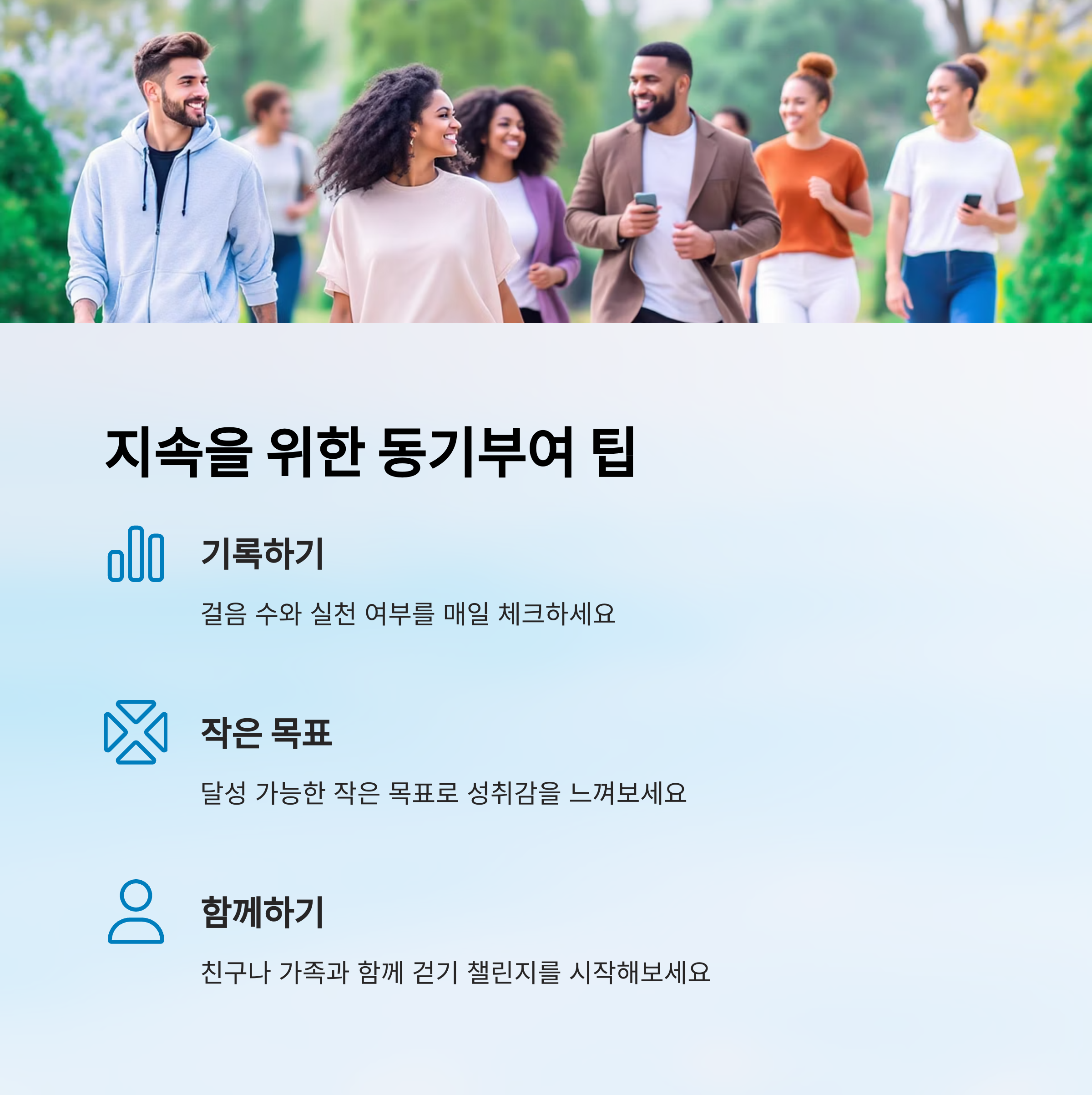 세 번째는 ‘함께하기’예요. 가족이나 친구와 함께 걷기 챌린지를 해보거나, 동네 걷기 모임에 참여하면 혼자 할 때보다 재미와 책임감이 생겨요. 요즘은 온라인 걷기 커뮤니티도 많아서 참여하기 쉽답니다.