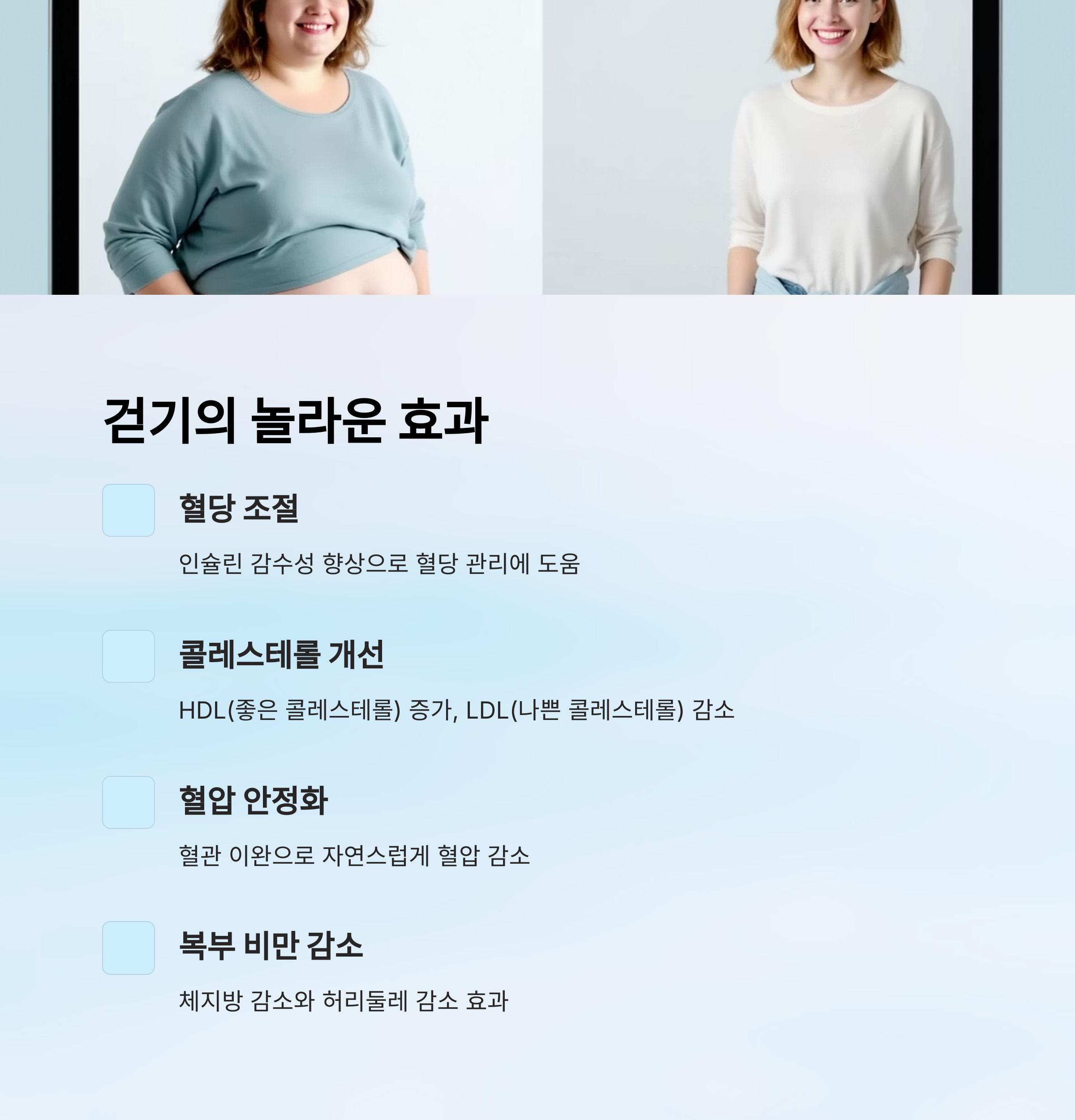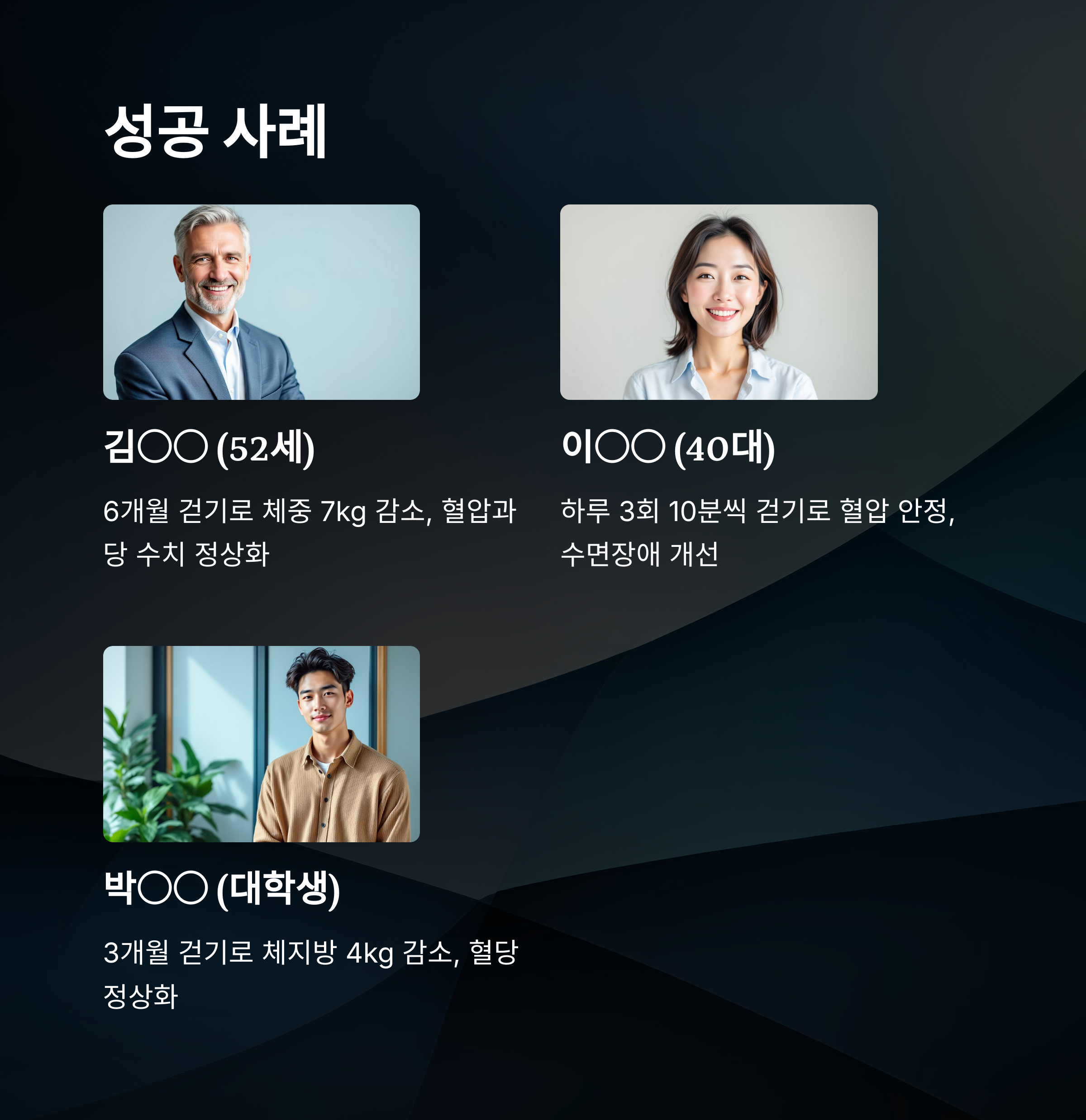 👨⚕️ 52세 직장인 김모 씨는 매년 건강검진에서 고혈압, 고지혈증, 당뇨 위험군이라는 결과를 받아왔어요. 하지만 운동이 너무 힘들고 어렵게만 느껴져서 방치하고 있었죠. 어느 날부터 출퇴근길 지하철 한 정거장 전에서 내려 걷기를 시작했어요. 6개월 뒤, 체중은 7kg 줄고, 복부비만도 개선돼 의사에게 '정상 범주로 회복' 판정을 받았다고 해요.