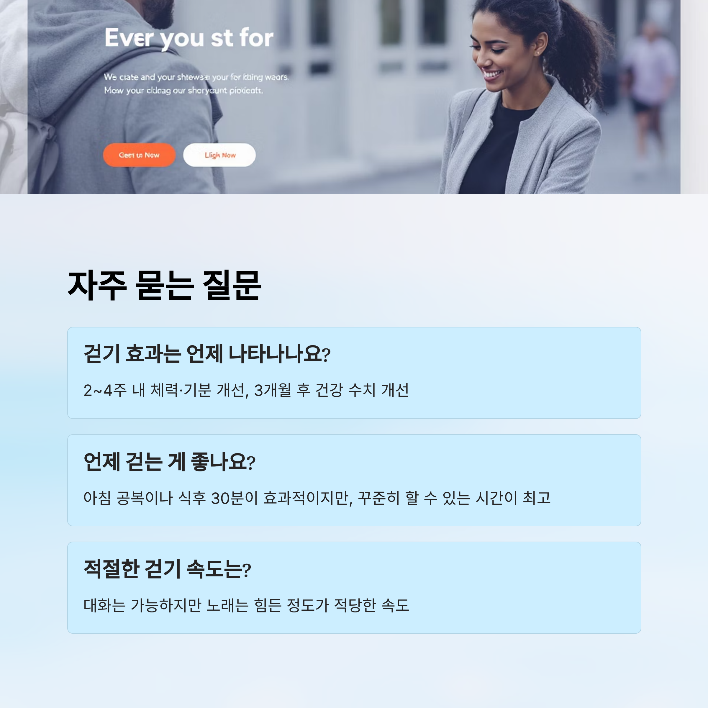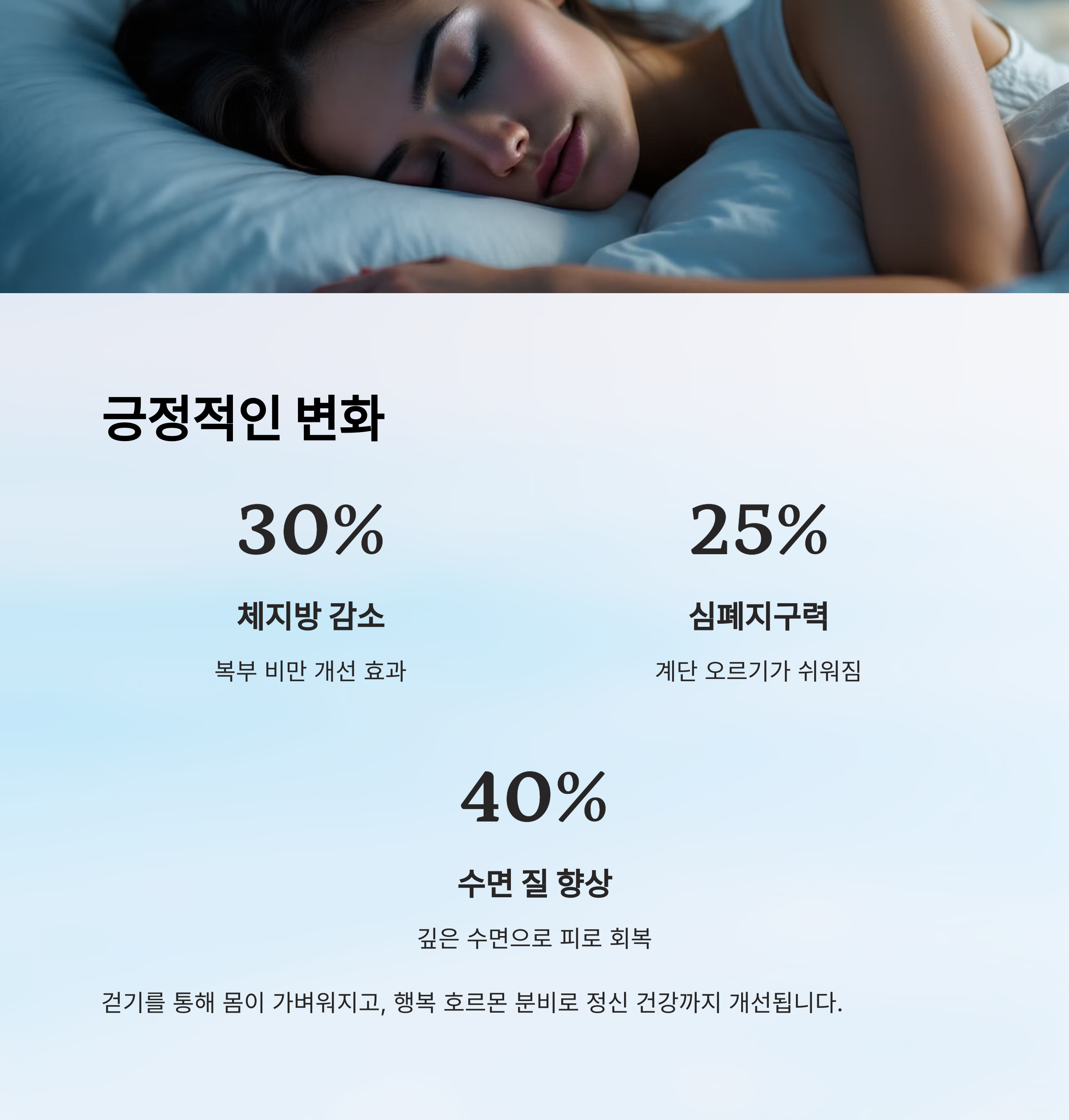 걷기를 한 달 이상 꾸준히 실천한 분들 중 많은 사람들이 “몸이 가벼워졌다” “계단 오르기가 쉬워졌다”는 변화를 이야기해요. 이런 변화는 심폐지구력 향상으로 연결돼요. 이전에는 조금만 움직여도 숨이 차던 사람들이 걷기를 통해 전보다 훨씬 편안한 일상을 느끼게 돼요.