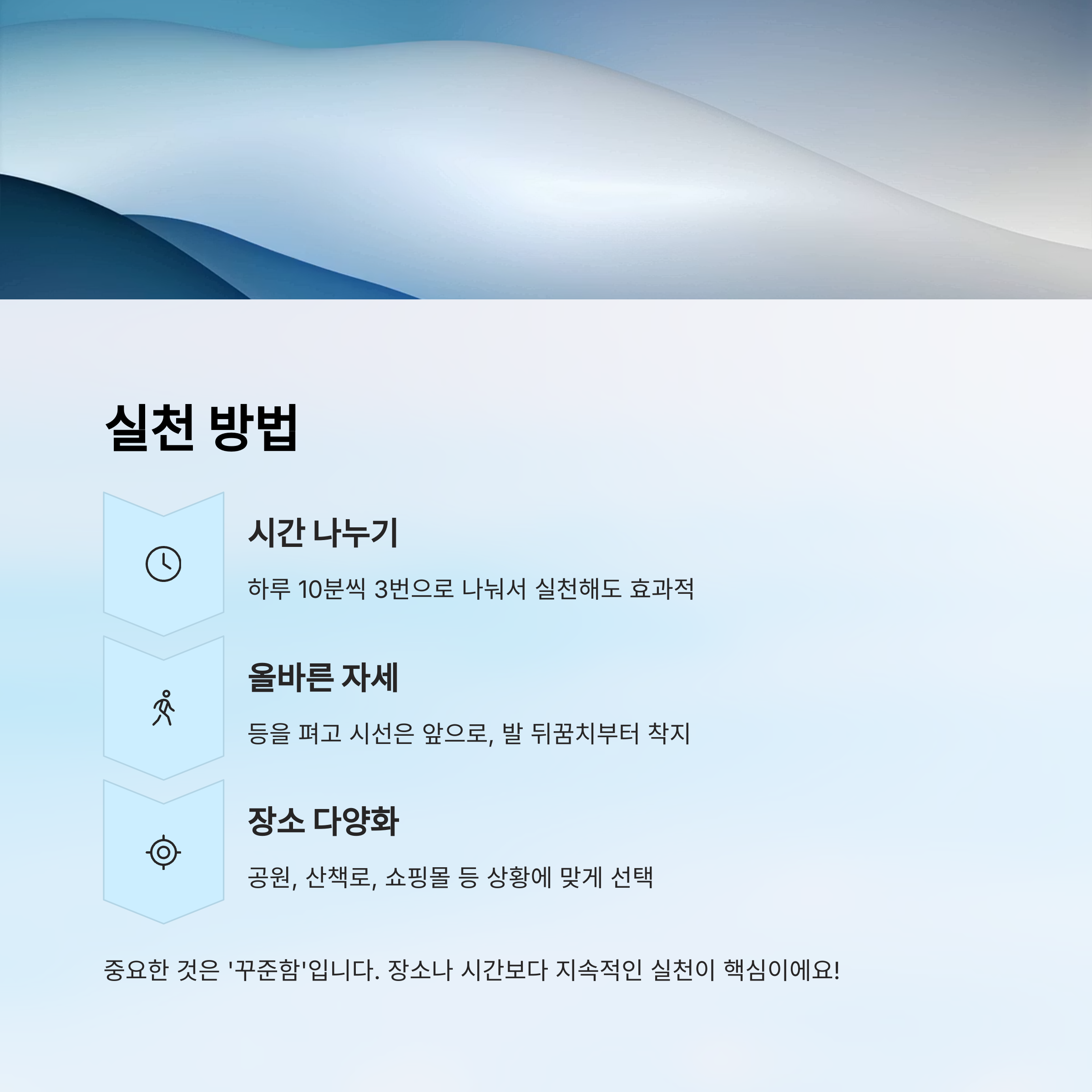 하루 30분 걷기를 꾸준히 실천하려면 무엇보다도 ‘습관화’가 중요해요. 처음에는 10분씩 나눠서 시작해도 괜찮아요. 예를