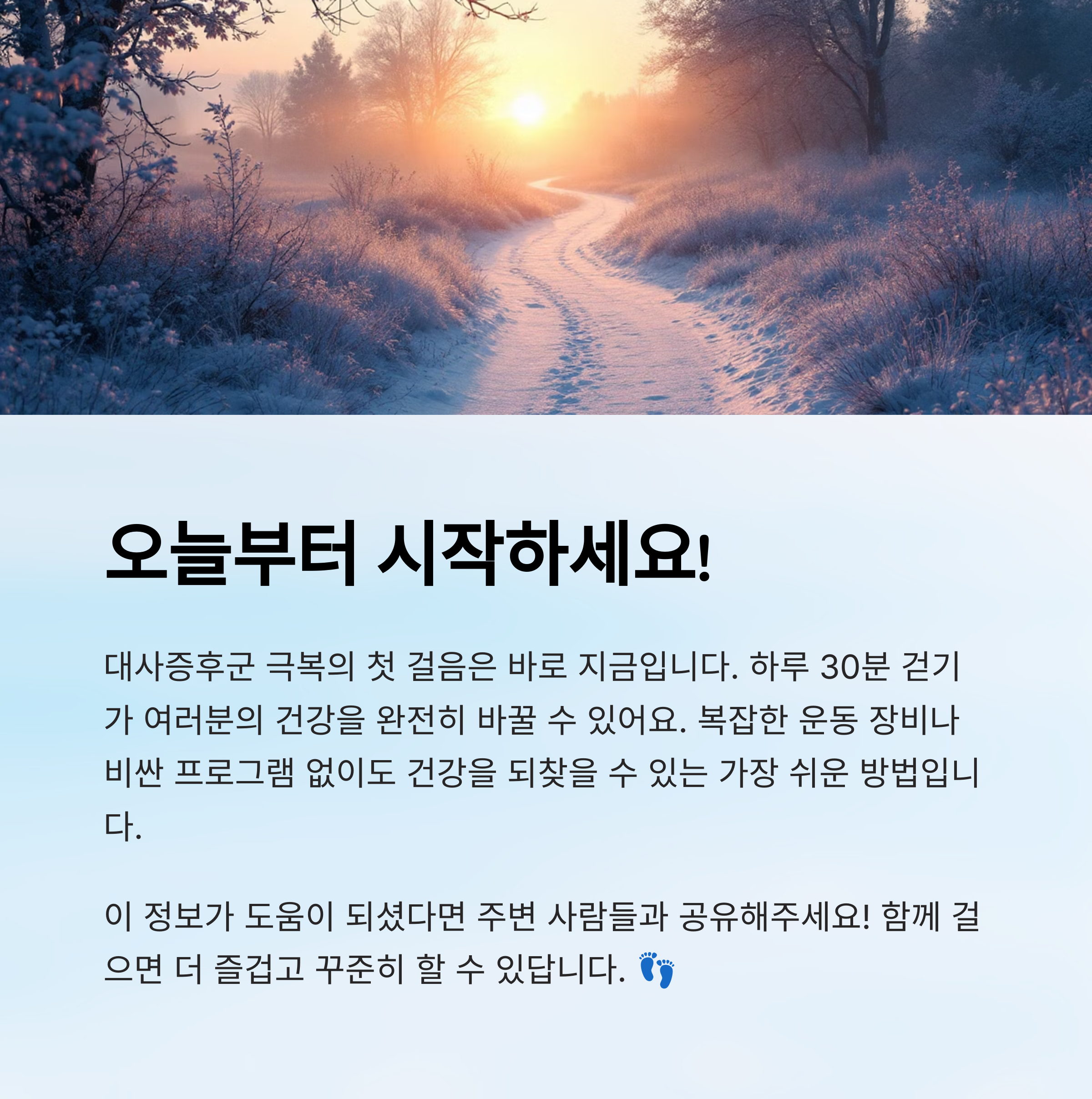하지만 다행히도 매일 30분 정도 걷는 습관만으로도 대사증후군의 위험 요소를 크게 낮출 수 있다는 연구들이 계속 발표되고 있어요. 실제로 운동 중에서도 '걷기'는 간단하면서도 꾸준히 실천하기 쉬운 최고의 방법 중 하나랍니다.