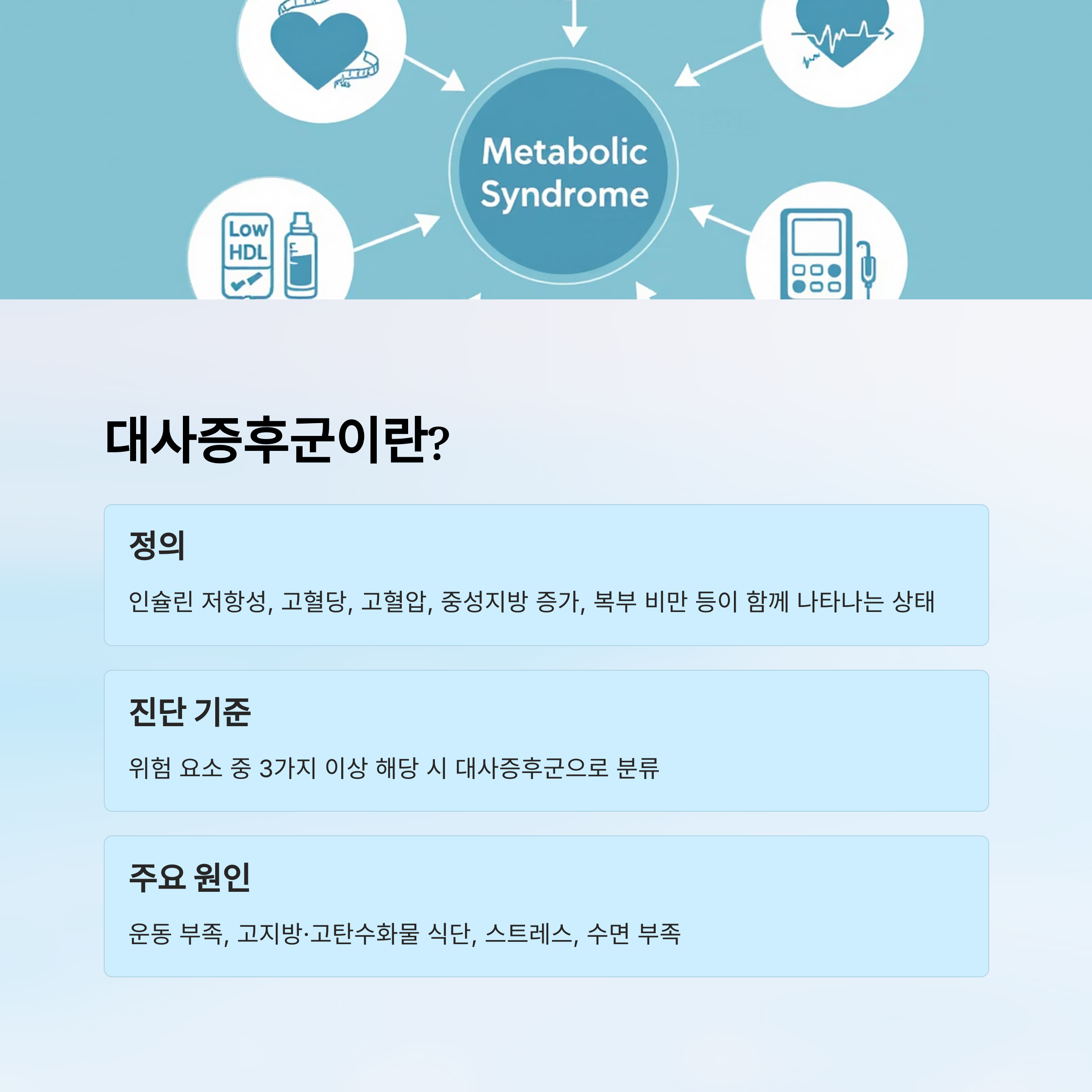 대사증후군은 말 그대로 '대사' 기능에 문제가 생긴 상태를 말해요. 인슐린 저항성, 고혈당, 고혈압, 중성지방 수치 증가, HDL 콜레스테롤 감소, 복부 비만 등이 함께 나타나면 대사증후군 진단을 받을 수 있어요. 이 중 3가지 이상이 해당되면 의학적으로 대사증후군으로 분류돼요.