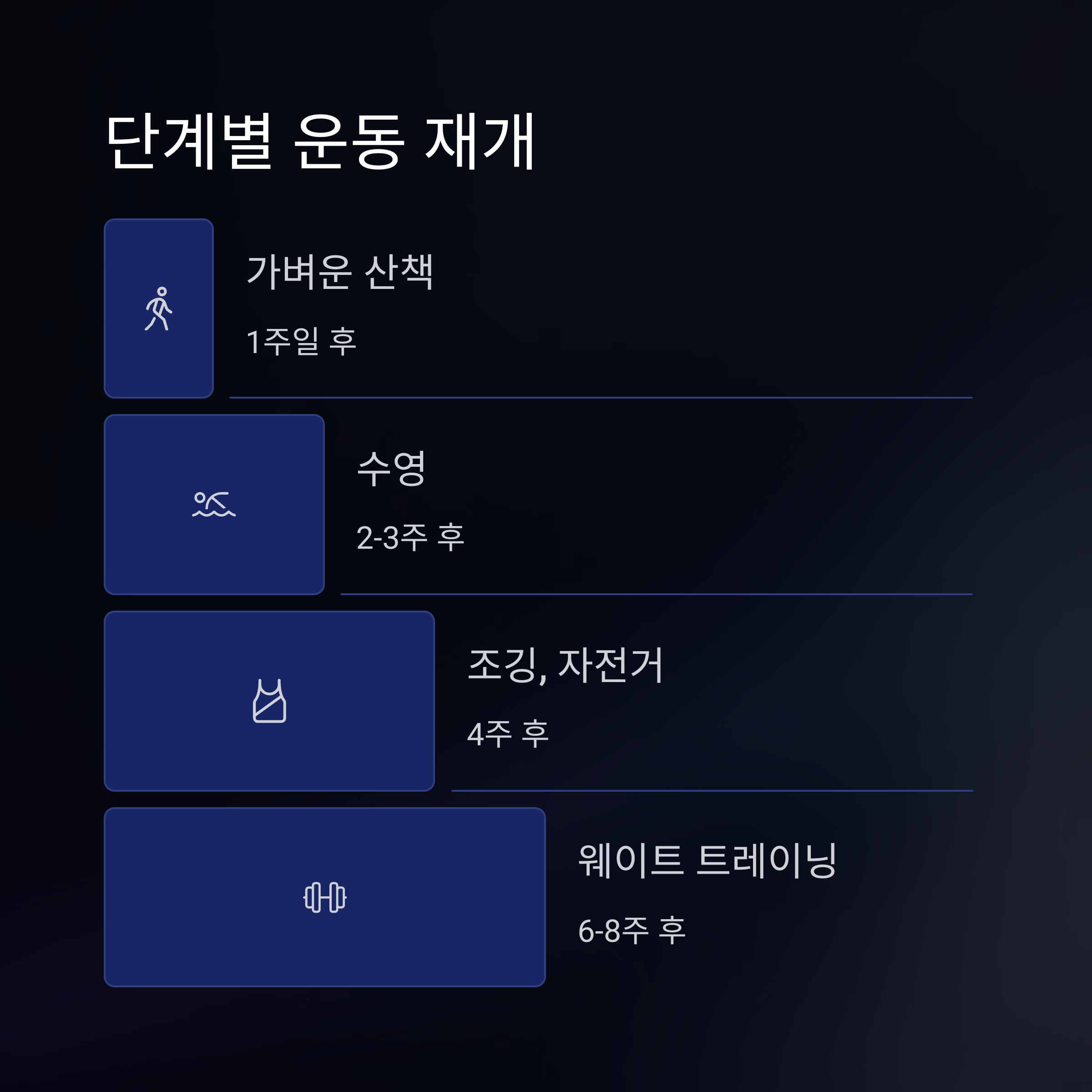 A4. 가벼운 걷기는 1~2주 후부터 가능하고, 스트레칭은 2~4주 후, 유산소 운동은 4~6주 후, 근력 운동은 최소 3개월 후부터 시작하는 것이 좋아요.