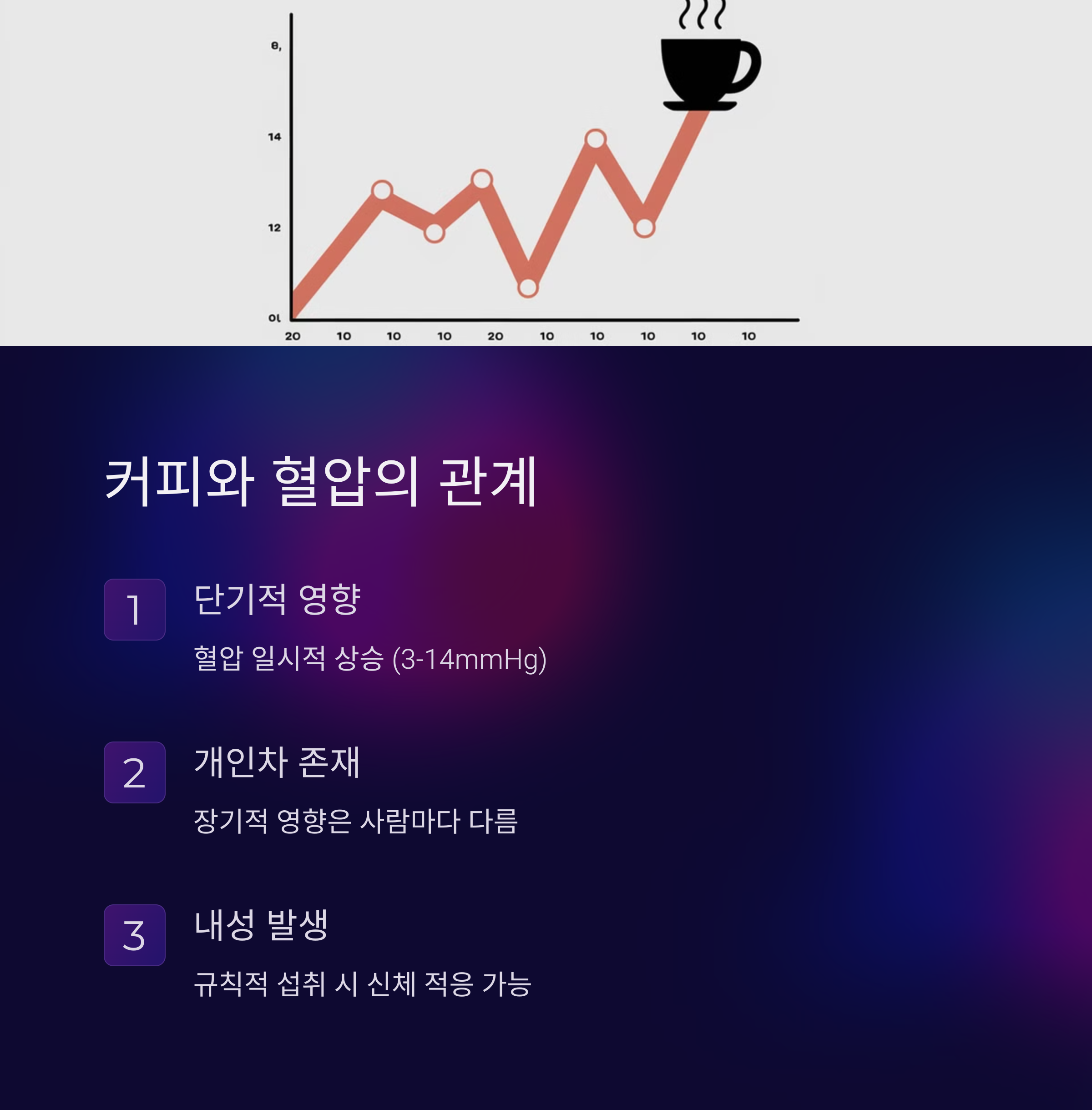 커피와 혈압의 관계는 개인 차이가 크기 때문에, **본인의 혈압 변화를 체크하면서 적절한 양을 조절하는 것이 가장 중요해요!** ☕🩺
