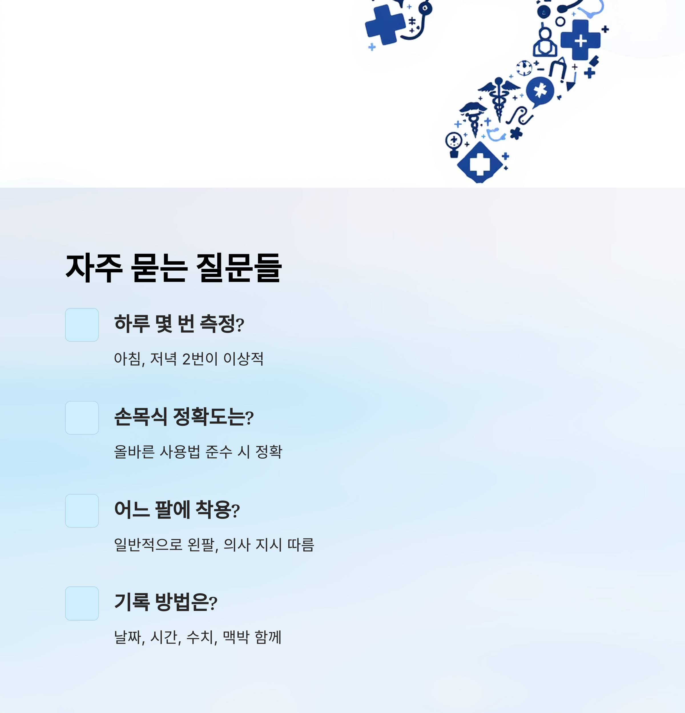 정확한 수치는 정확한 습관에서 나와요. 일상 속 작은 실수들을 줄이는 것만으로도 보다 신뢰도 높은 혈압 기록을 남길 수 있답니다 😊