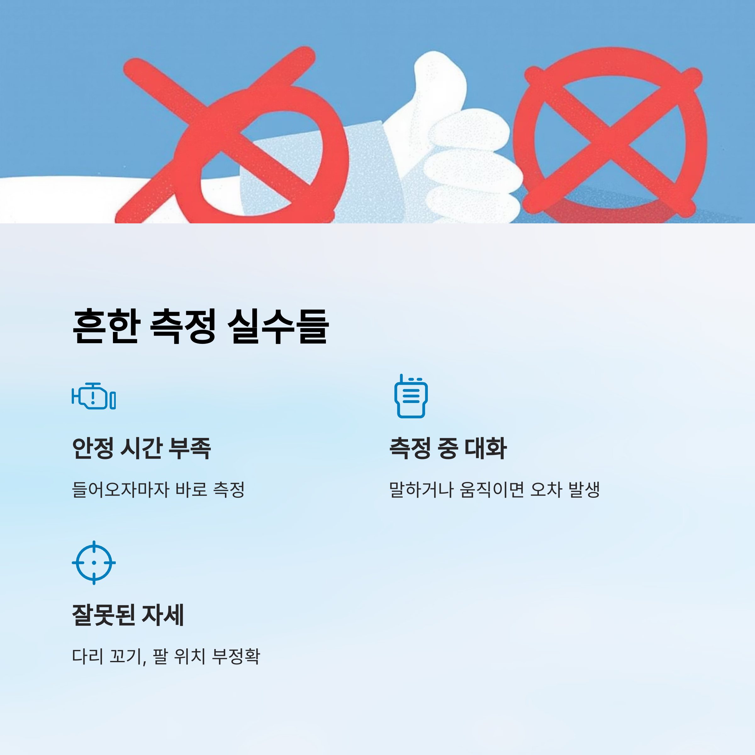 | 측정 전 준비 부족 | 들어오자마자 바로 측정 | 5분간 안정 후 측정 |