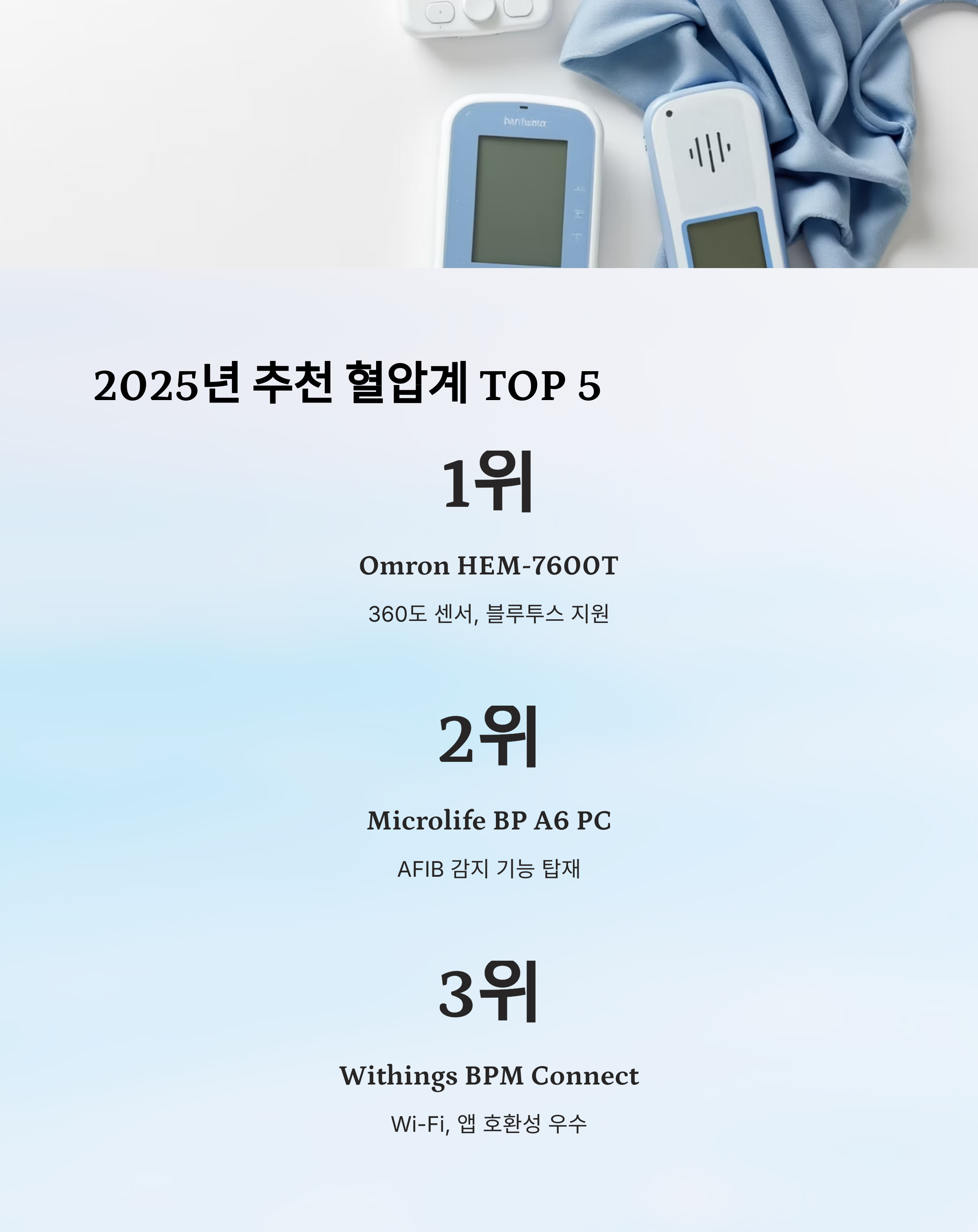 혈압계를 선택할 때는 정확도, 사용 편의성, 연결성(앱 연동 여부), 디스플레이 크기 등을 종합적으로 고려하는 게 좋아요. 아래는 2025년 기준으로 사용자 만족도와 전문가 추천을 받은 TOP 5 제품이에요.