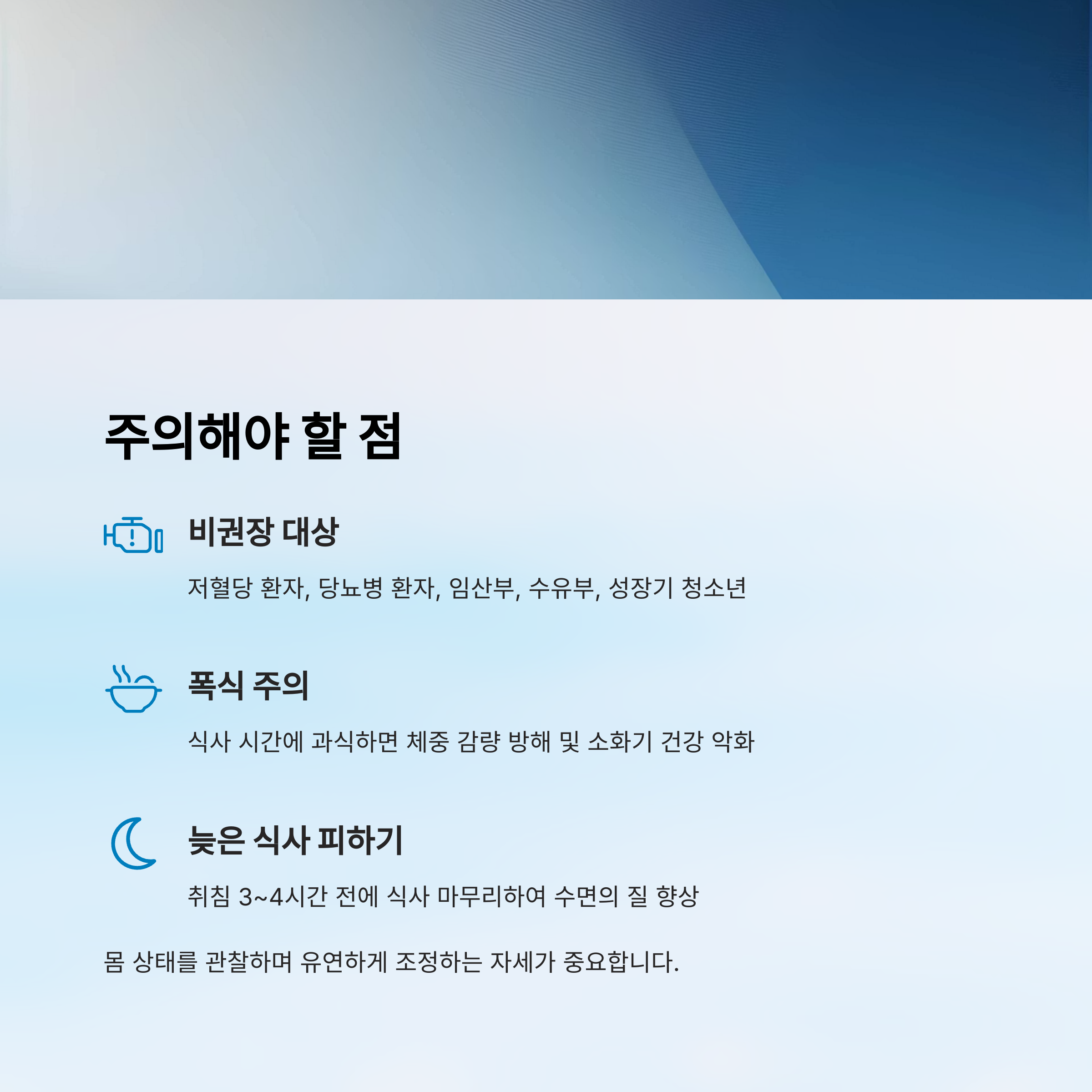 | 생리 불순 | 과도한 단식 시 발생 가능 | 무리하지 말고 주기적 점검 |