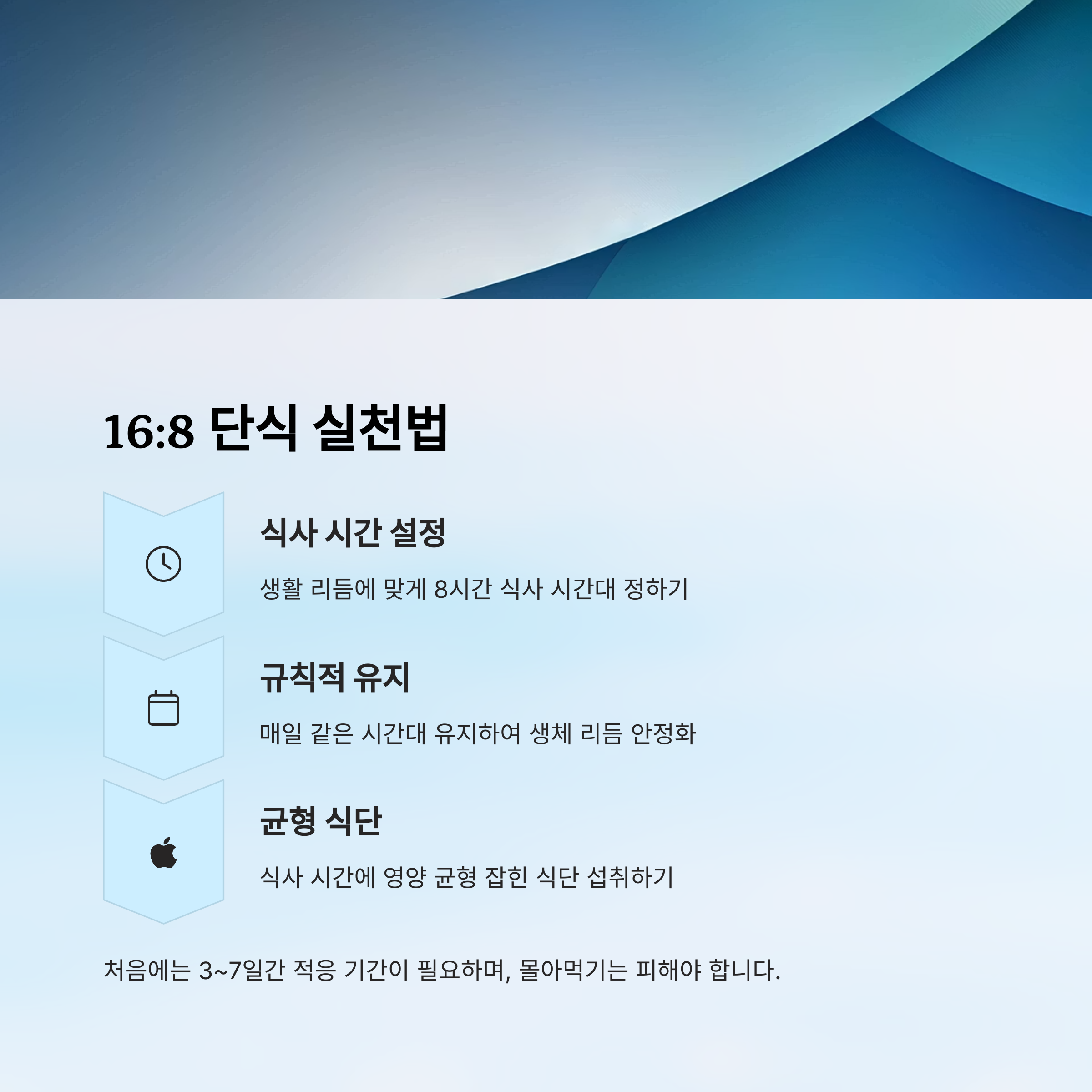 | 16:8 | 16시간 | 8시간 | 초보자, 직장인 |