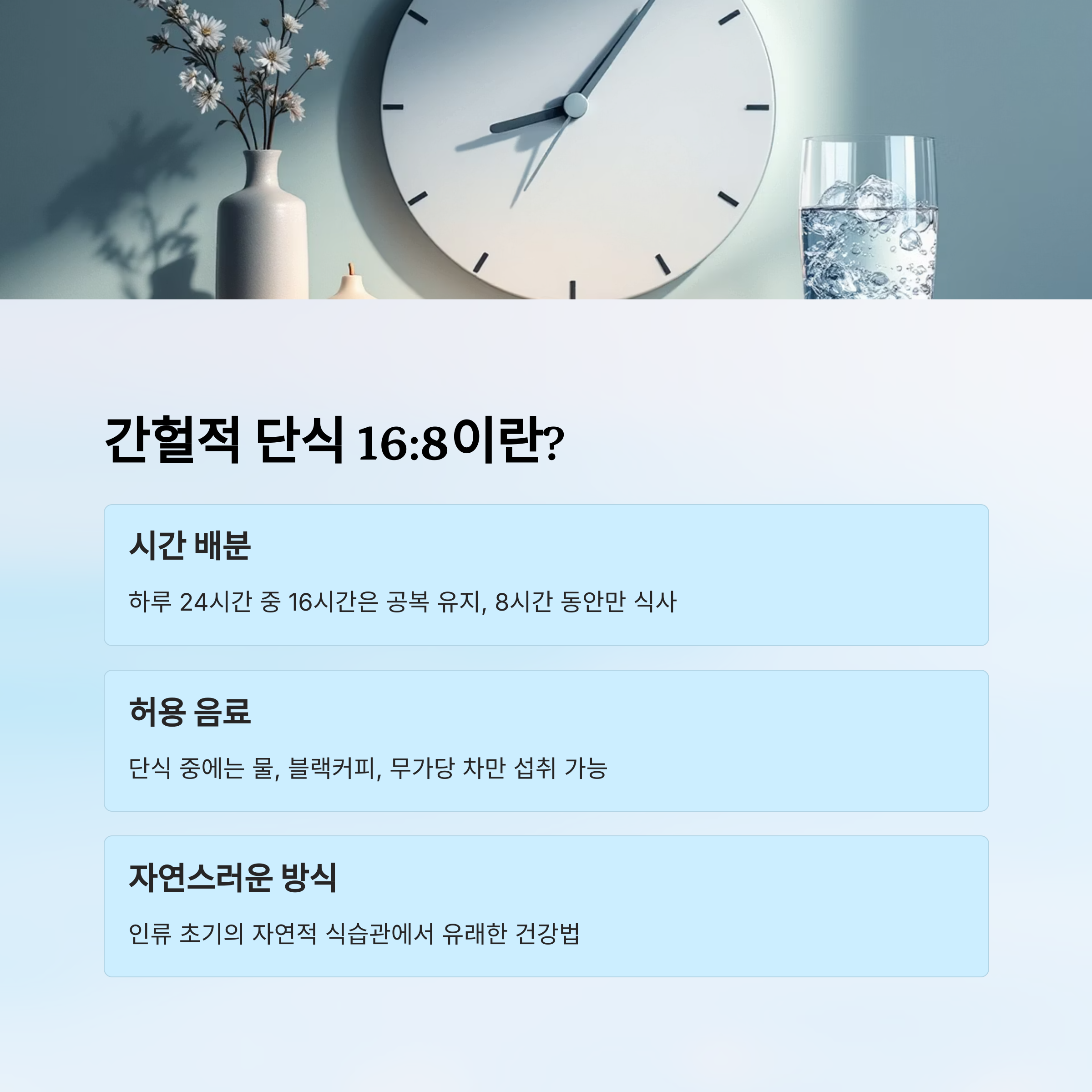 간헐적 단식은 일정한 시간 동안 식사를 하지 않고 공복 상태를 유지하는 식습관이에요. 이 중 16:8 방식은 하루 24시간 중 16시간을 금식하고 8시간 동안만 식사를 허용하는 가장 대중적인 유형이죠. 예를 들어, 오후 12시부터 저녁 8시까지 음식을 섭취하고, 나머지 시간에는 물, 커피, 차 등 칼로리가 없는 음료만 마시는 방식이에요.