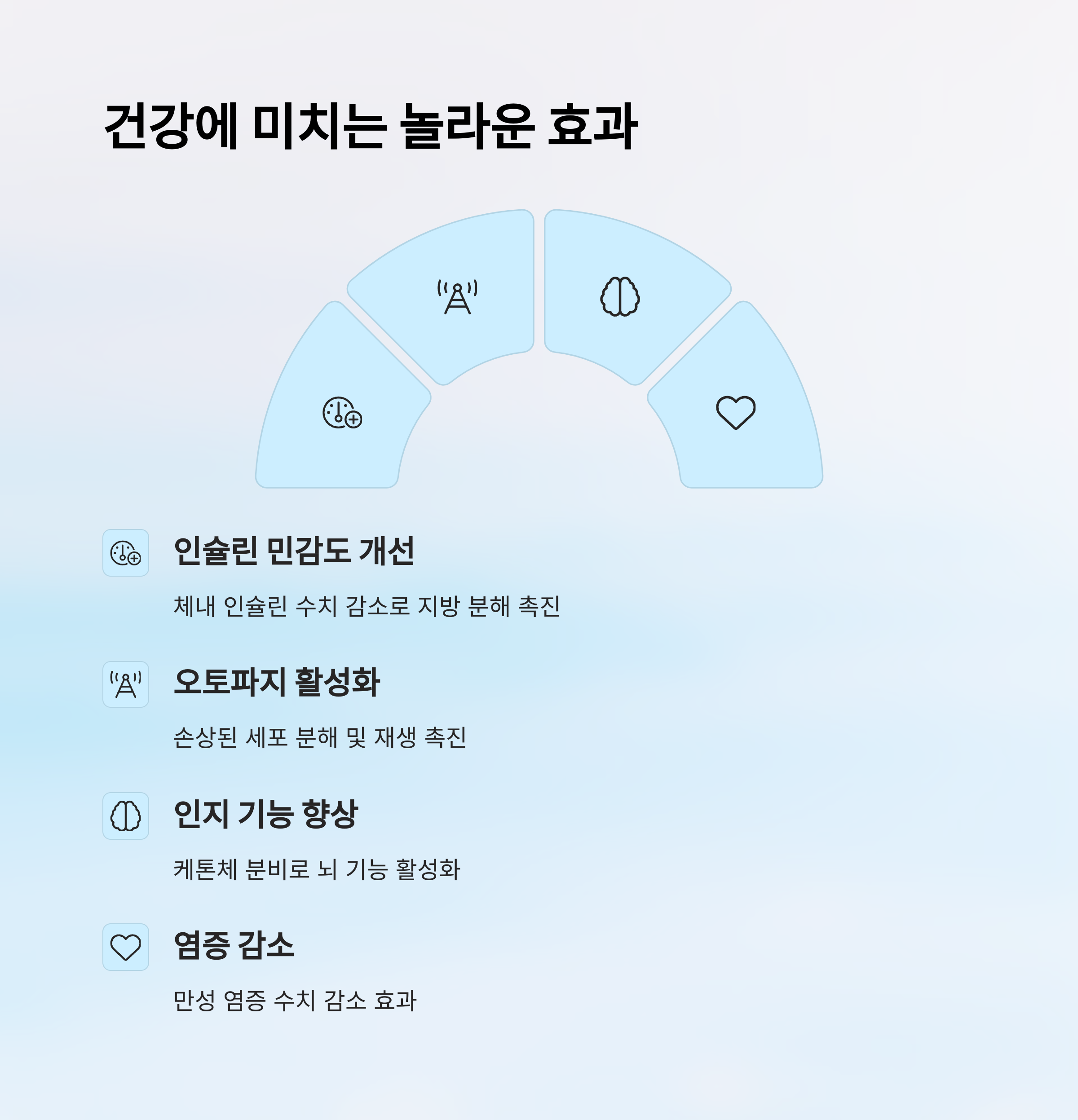 | 뇌 기능 강화 | 케톤체 활용으로 집중력과 기억력 향상 |