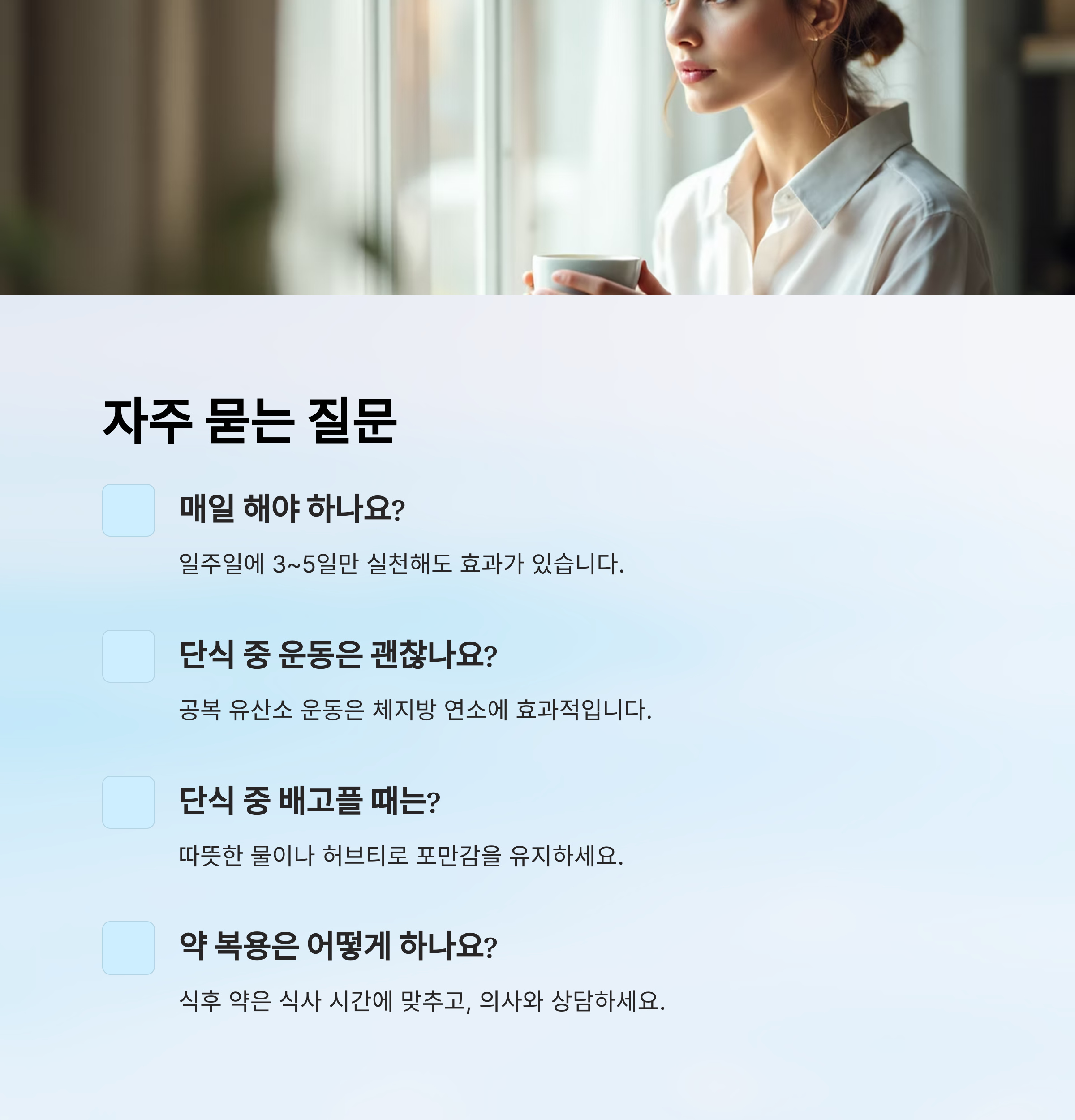 A2. 공복 운동도 괜찮아요! 유산소 운동은 아침 공복에 하면 체지방 연소 효과가 높고, 근력 운동은 식사 직후 하는 게 좋아요. 몸 상태에 따라 강도를 조절하세요.