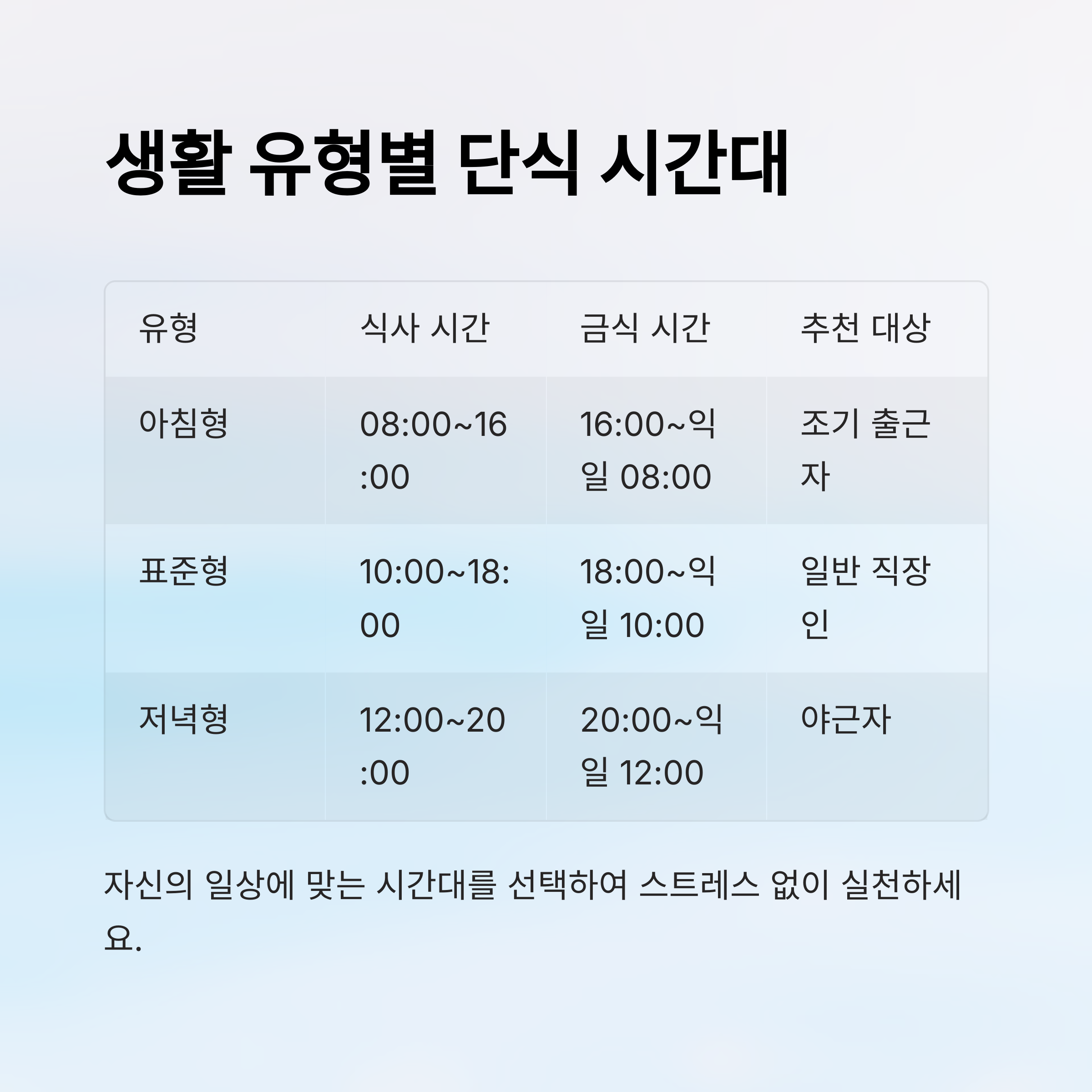 | 유동형 | 유동적으로 설정 | 단 8시간 식사 준수 | 자영업자, 프리랜서 |