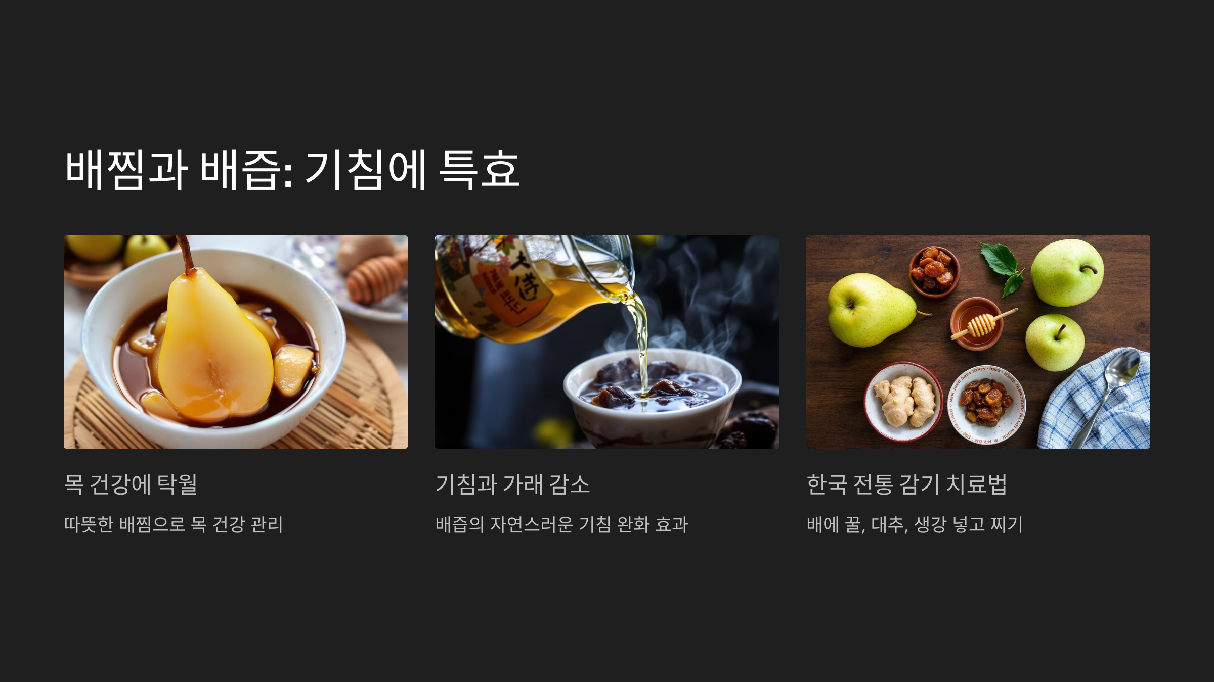 배는 목 건강에 탁월한 효과가 있어 기침과 가래를 줄여줍니다. 특히 배찜은 한국 전통 방식으로 감기 치료에 많이 사용돼 왔어요.