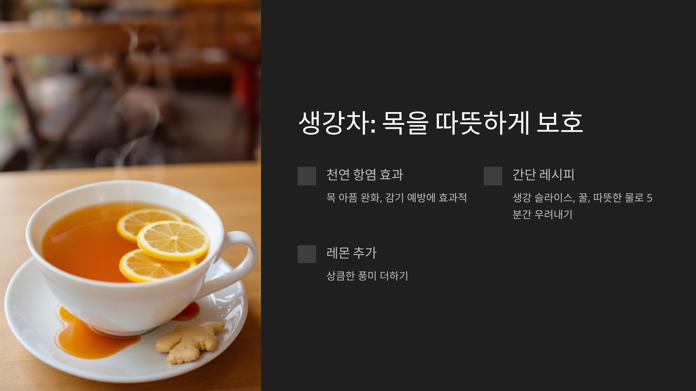 🥇 1. 생강차: 목을 따뜻하게 보호 💛
