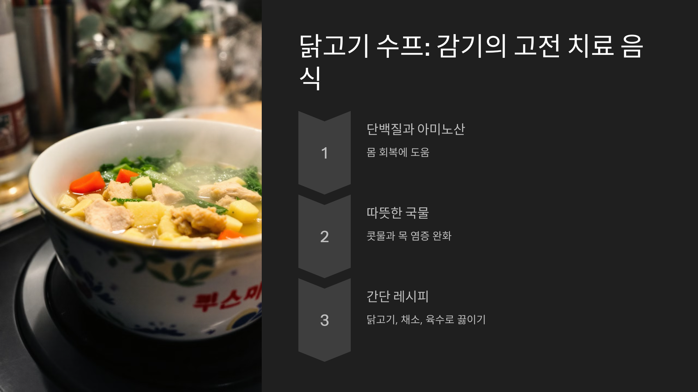 감기에 걸렸을 때 따뜻한 닭고기 수프 한 그릇은 기적 같은 효과를 줍니다. 닭고기는 단백질과 아미노산이 풍부해 몸을 회복시키고, 따뜻한 국물은 콧물과 목의 염증을 완화시켜 줍니다.