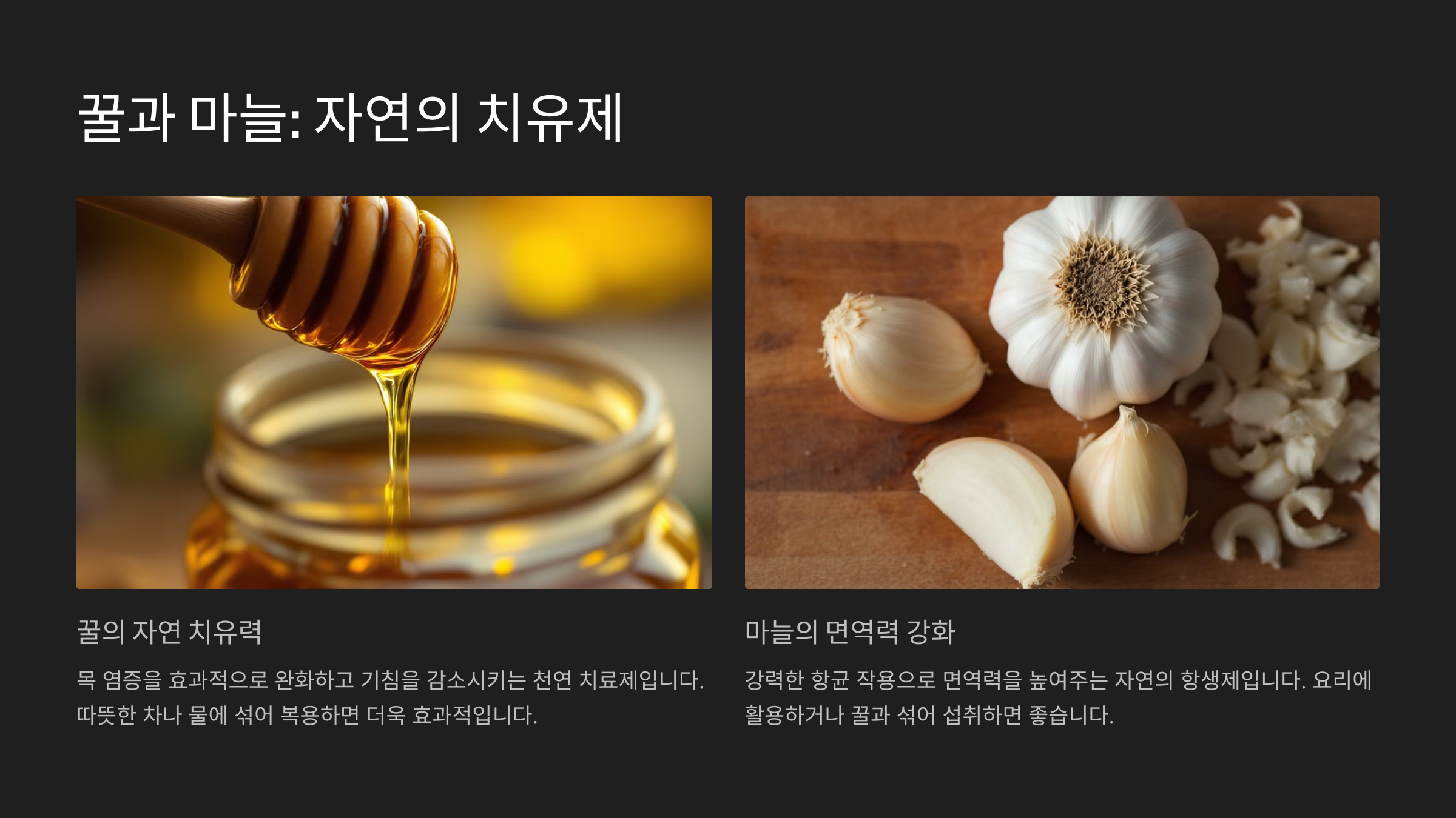 꿀은 목의 염증을 가라앉히고 기침을 줄이는 데 탁월한 효과가 있어요. 특히, 따뜻한 차나 물에 섞어 마시면 몸을 따뜻하게 하고, 진정 효과를 더합니다.