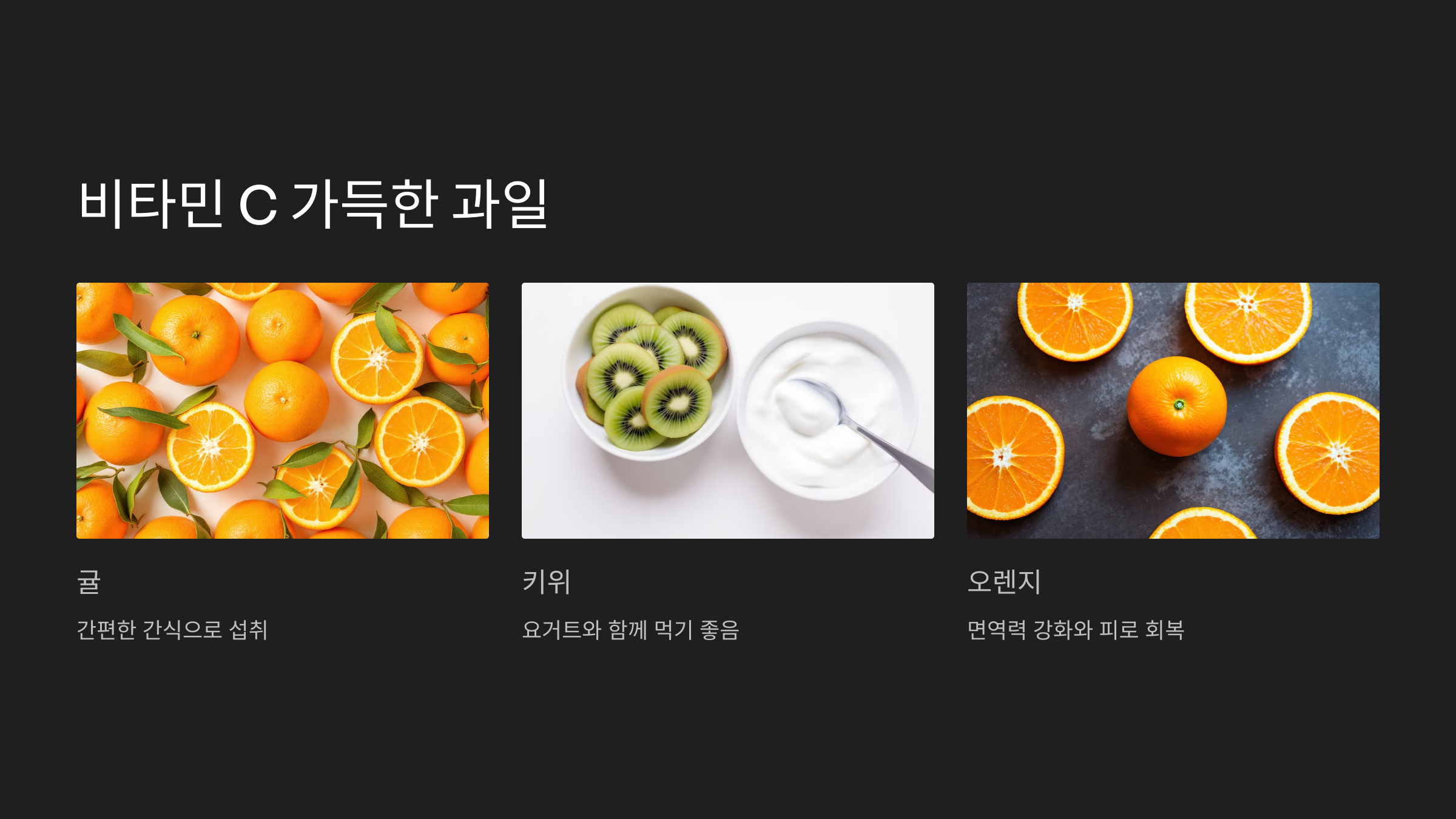 감기에 걸렸을 때 비타민 C는 필수! 귤, 키위, 오렌지 같은 과일은 면역력을 강화하고 피로 회복에도 도움을 줍니다. 감기에 걸리기 전에 자주 섭취하면 예방 효과도 기대할 수 있어요.