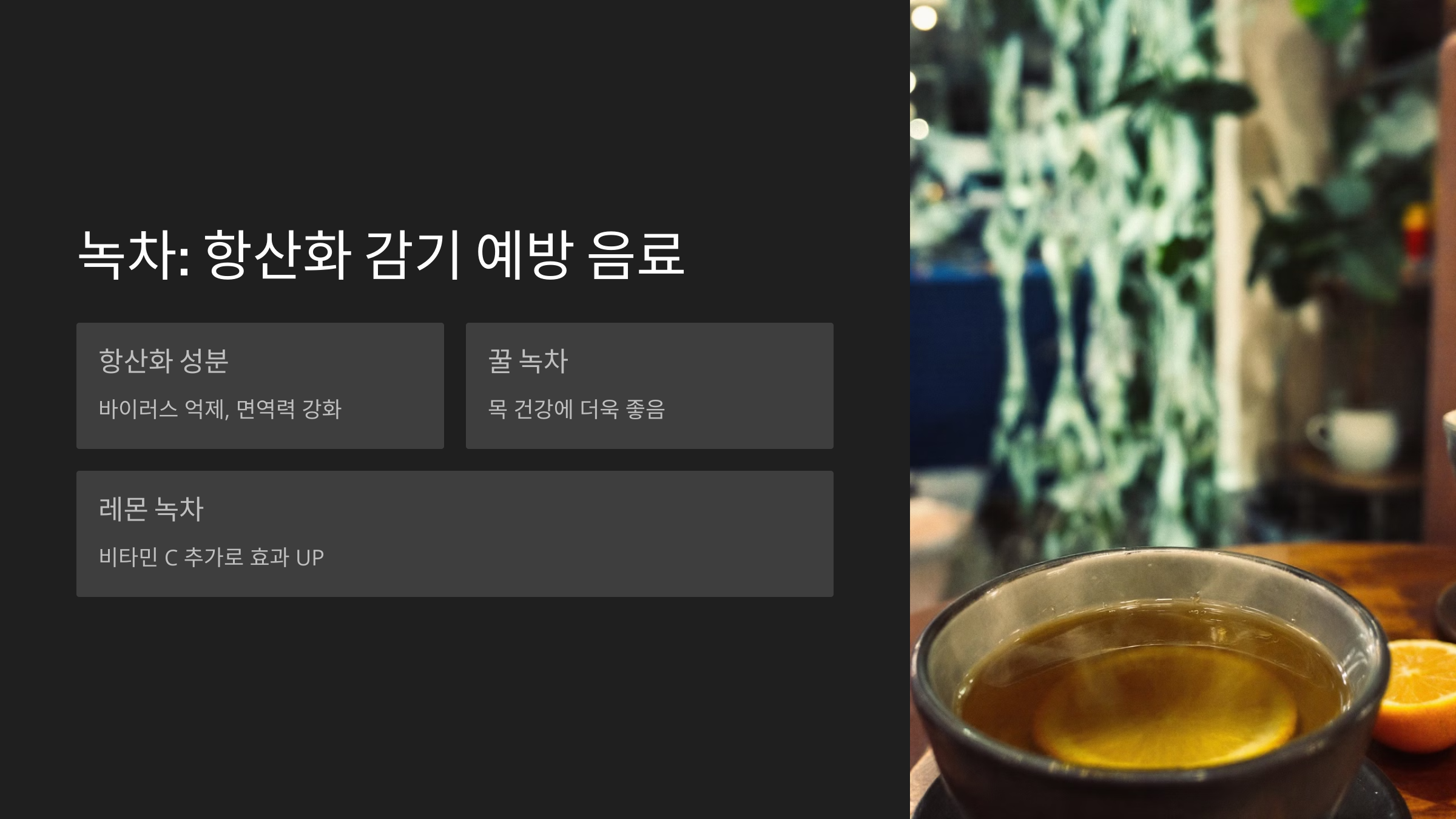 녹차에는 강력한 항산화 성분이 들어 있어 바이러스를 억제하고 면역력을 높여줍니다. 감기로 몸이 무거울 때 따뜻한 녹차 한 잔은 몸과 마음을 모두 편안하게 만들어 줄 거예요.