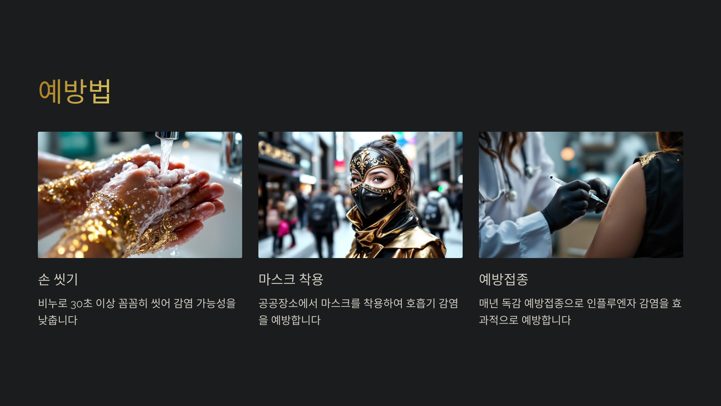 A4. 손 씻기, 충분한 휴식, 건강한 식습관이 기본적인 예방책이에요. 독감 예방접종은 독감 예방에 필수적이에요.
