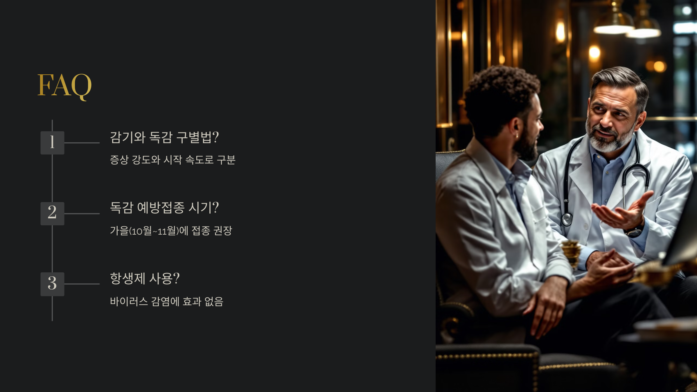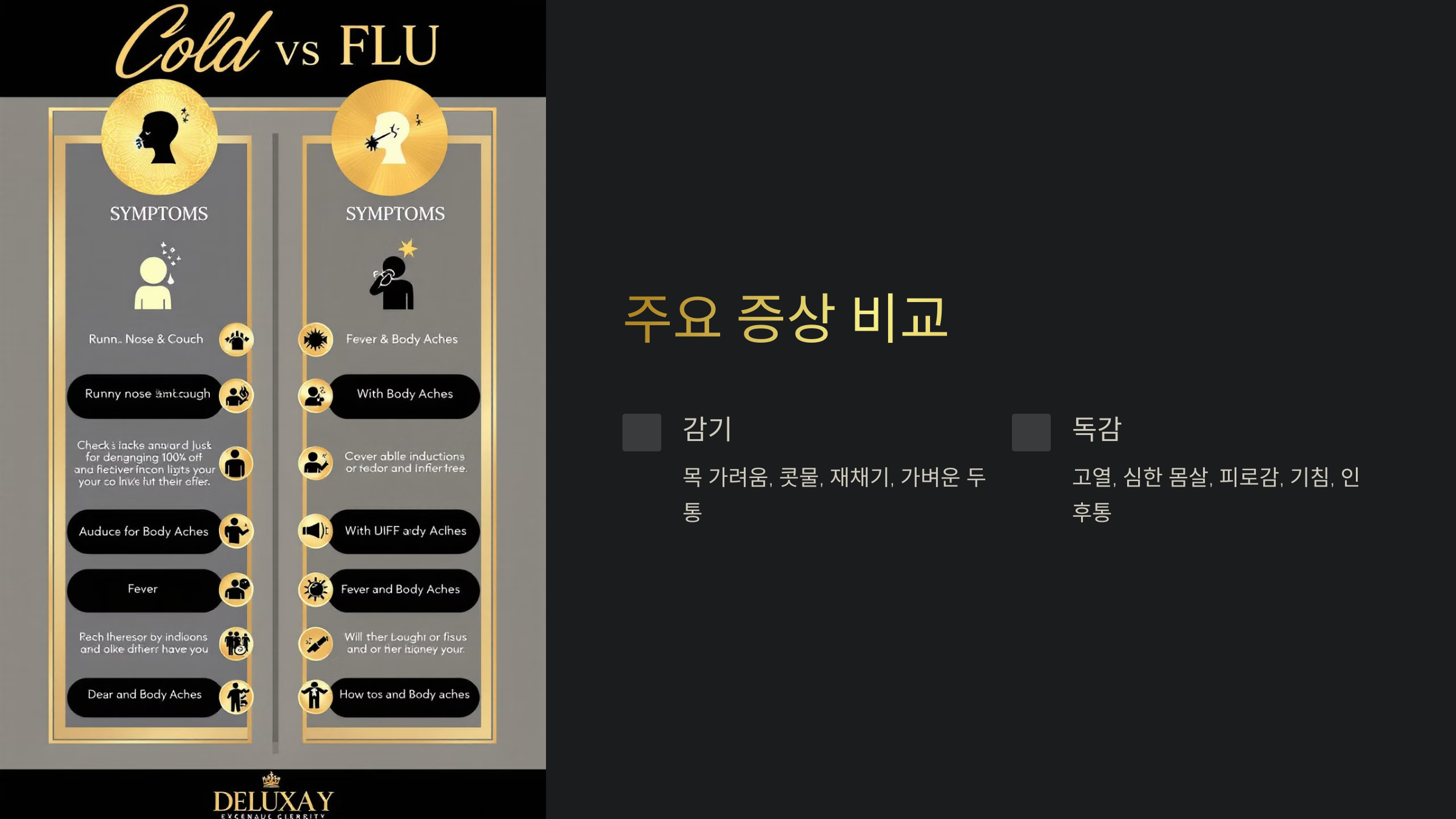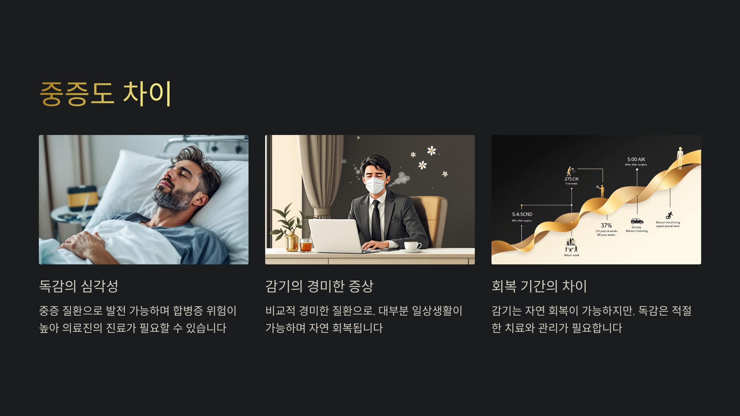 A1. 감기는 주로 경미한 증상(콧물, 목 아픔)으로 나타나지만, 독감은 고열, 심한 몸살, 피로감 등 증상이 더 심각하고 갑작스럽게 시작돼요.