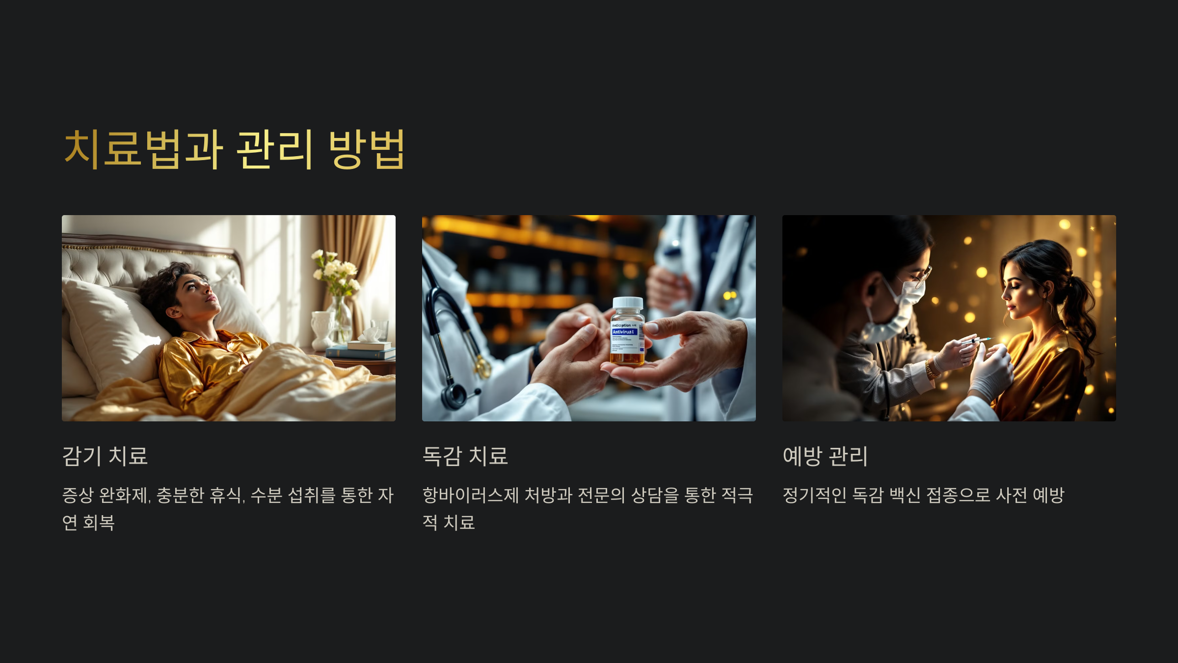독감은 항바이러스제(타미플루, 릴렌자 등)를 통해 증상 완화와 합병증 예방을 도모할 수 있어요. 항바이러스제는 증상이 시작된 지 48시간 이내에 복용하면 효과가 더 높아요. 독감 환자 역시 충분한 휴식과 수분 섭취가 중요하며, 증상이 심할 경우 의료 전문가의 도움을 받아야 해요.