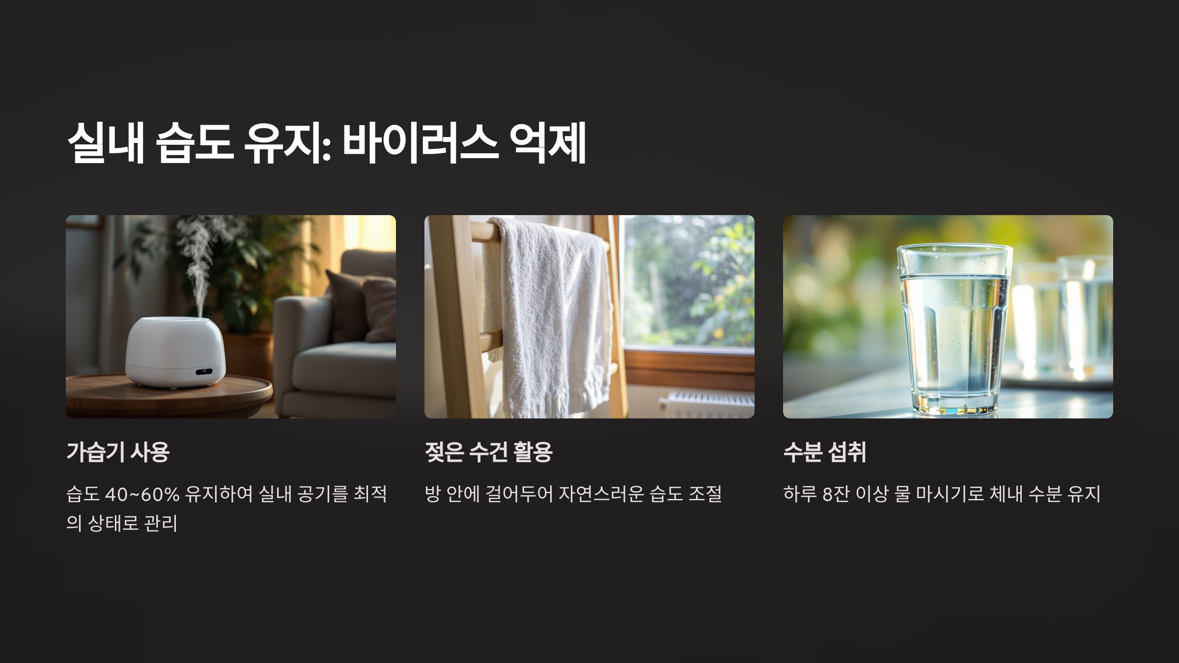 - 가습기 사용: 실내 습도를 40~60%로 유지하세요.