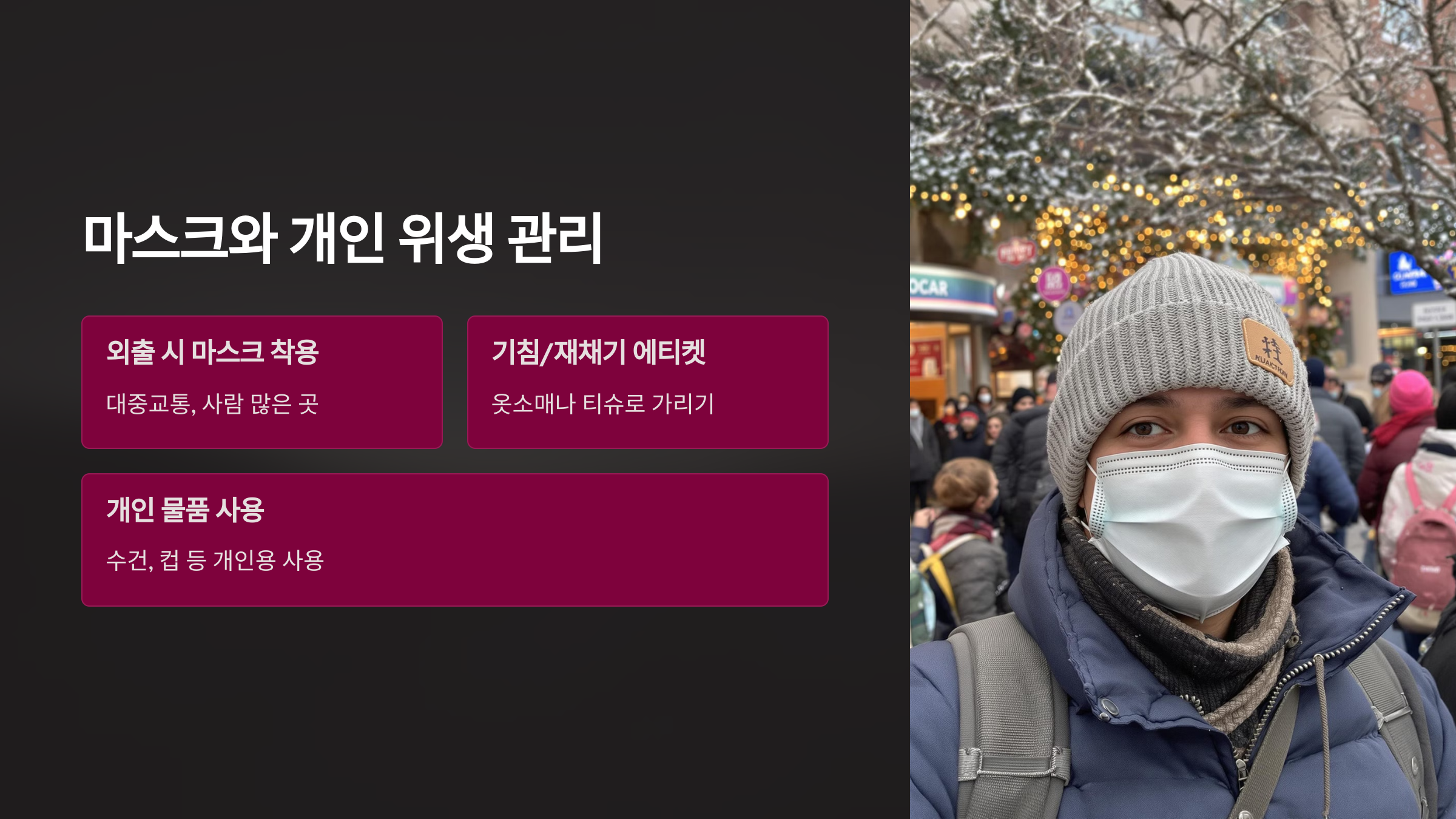 ✅ Tip: 마스크는 바이러스뿐 아니라 겨울철 찬바람으로부터 코와 목을 보호해주는 역할도 해요!
