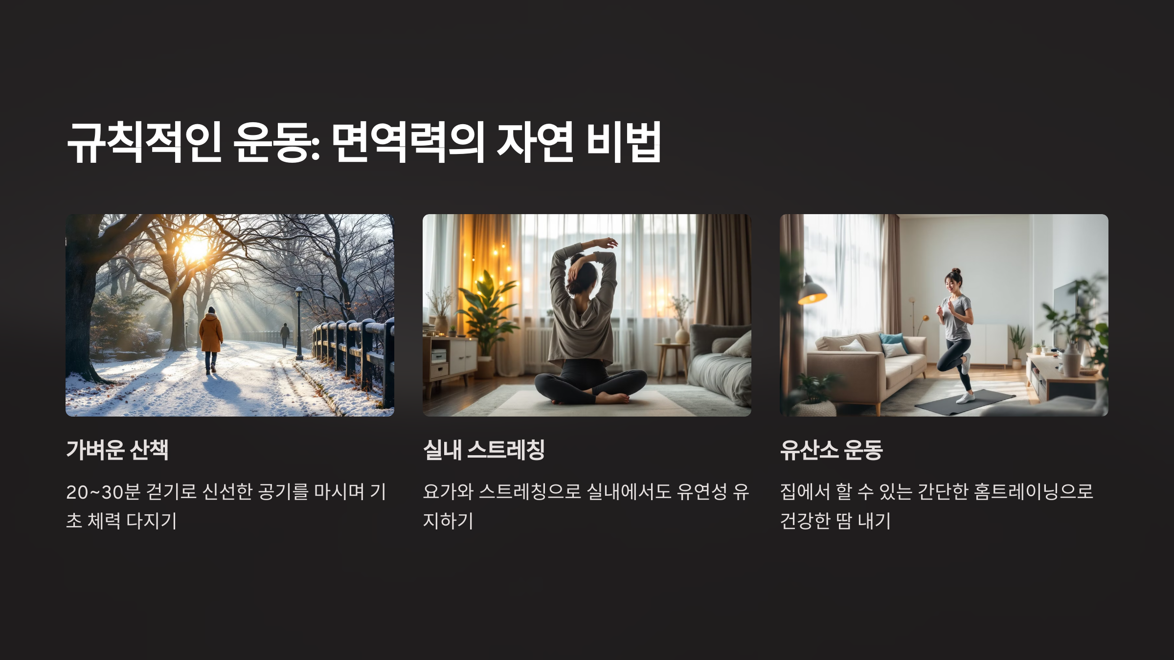 ✅ Tip: 무리한 운동은 오히려 면역력을 떨어뜨릴 수 있으니 적당히 즐기는 것이 중요해요.