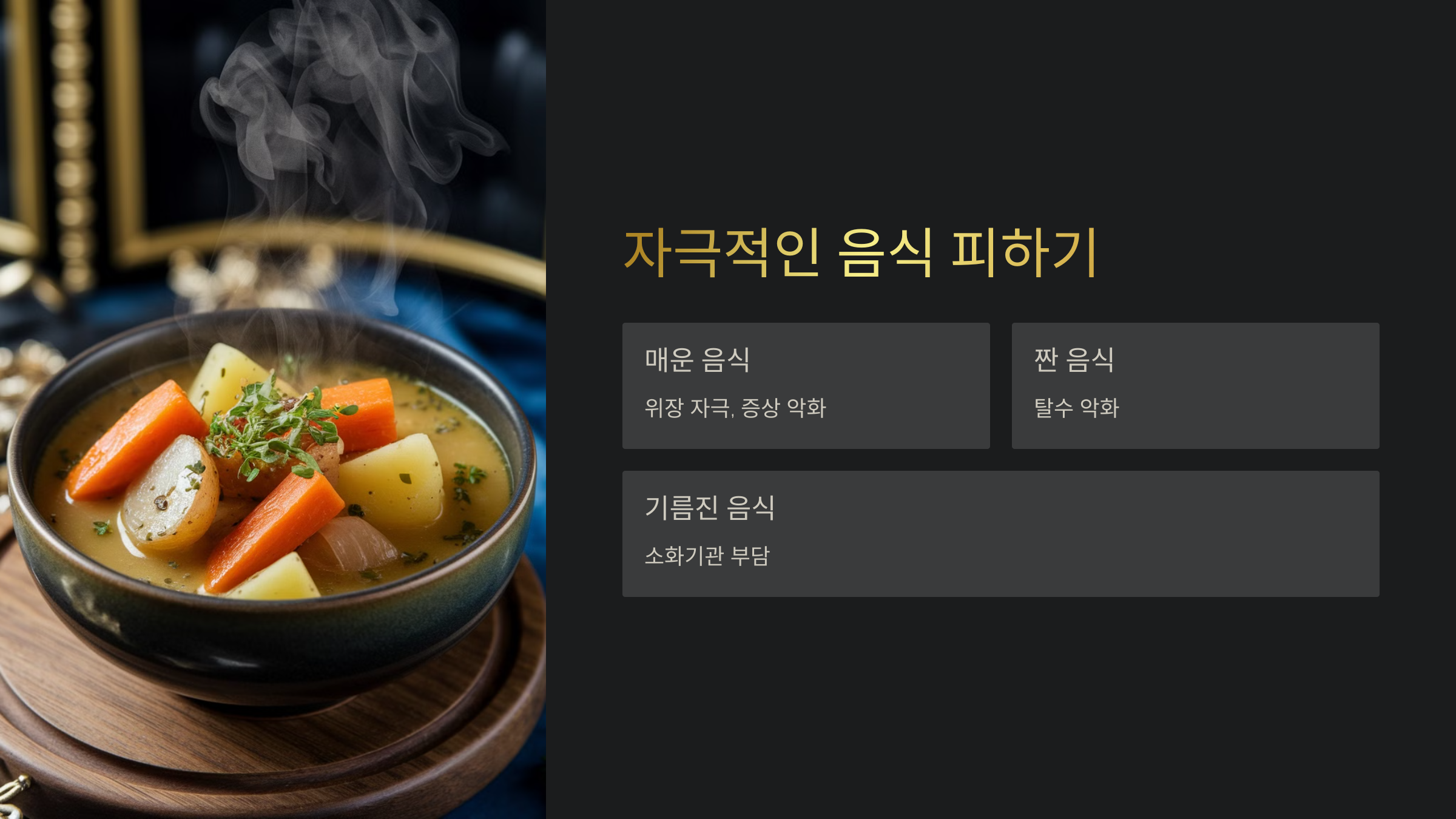 특히 매운 음식은 위산 분비를 촉진해 위장을 자극할 수 있고, 이는 감기 증상을 더 악화시킬 가능성이 있어요. 짠 음식 역시 몸의 수분을 빼앗아 탈수를 악화시킬 수 있답니다.