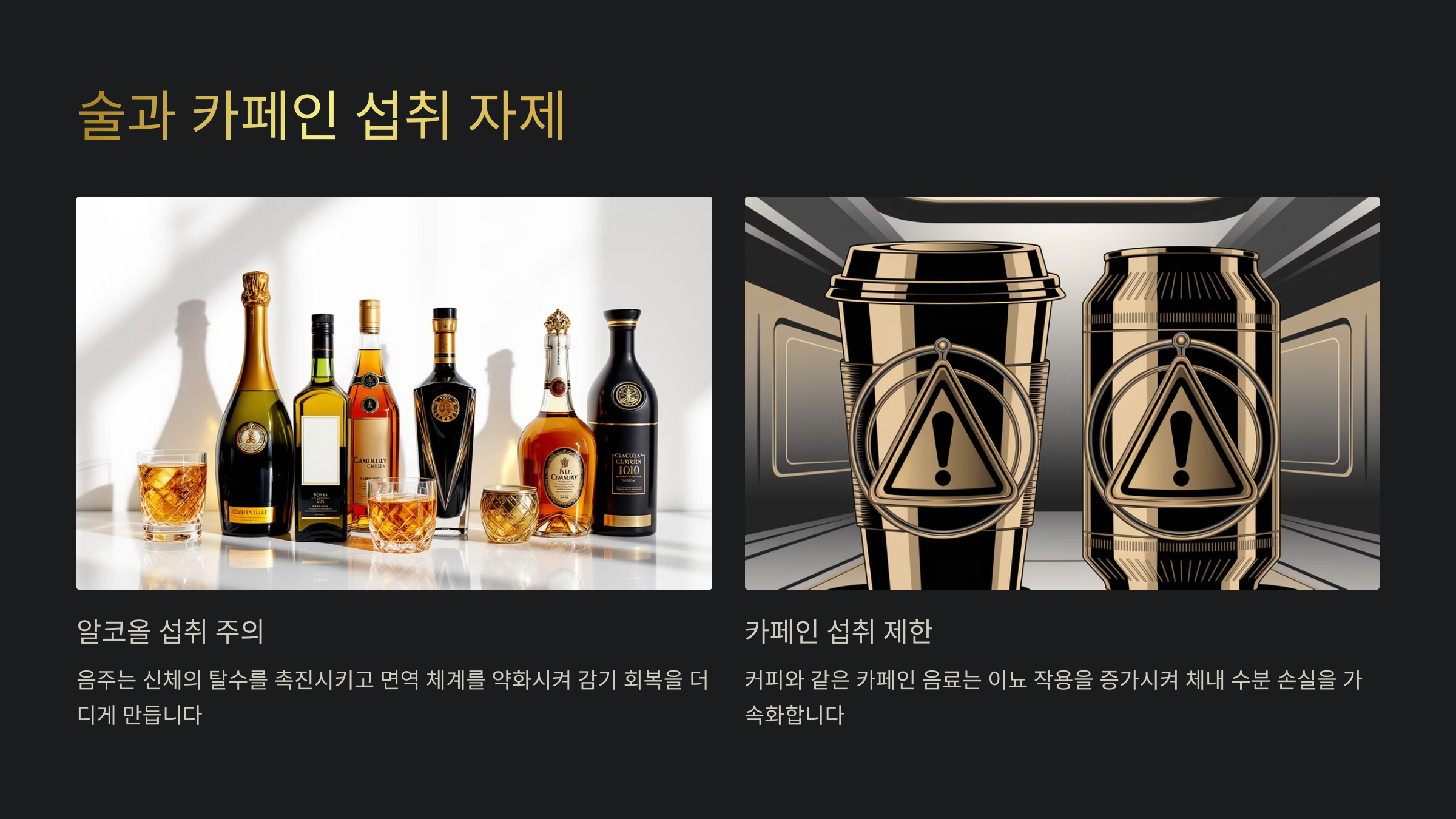 특히 술을 마시면 몸이 독소를 처리하는 데 더 많은 에너지를 소비하게 돼요. 이는 면역 체계가 감염과 싸우는 데 집중하지 못하게 만들죠. 따라서 감기 중에는 술이나 카페인을 완전히 피하는 것이 좋아요.
