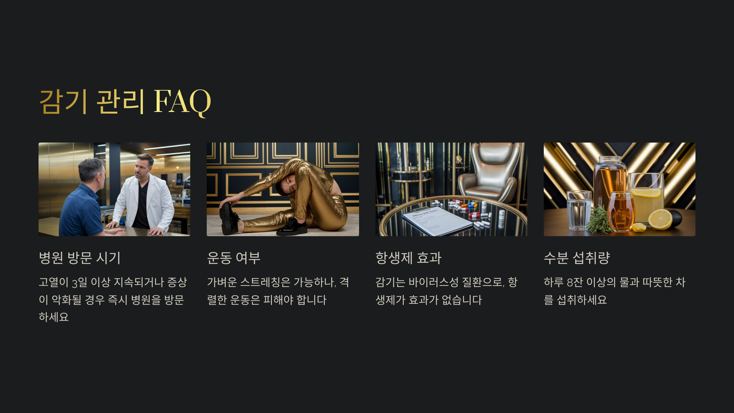 그래서 감기 상태에서는 운동 대신 스트레칭이나 간단한 체조 같은 가벼운 움직임 정도로 충분해요. 활동량을 조절해 면역 체계가 제대로 작동하도록 도와주는 것이 핵심이에요.