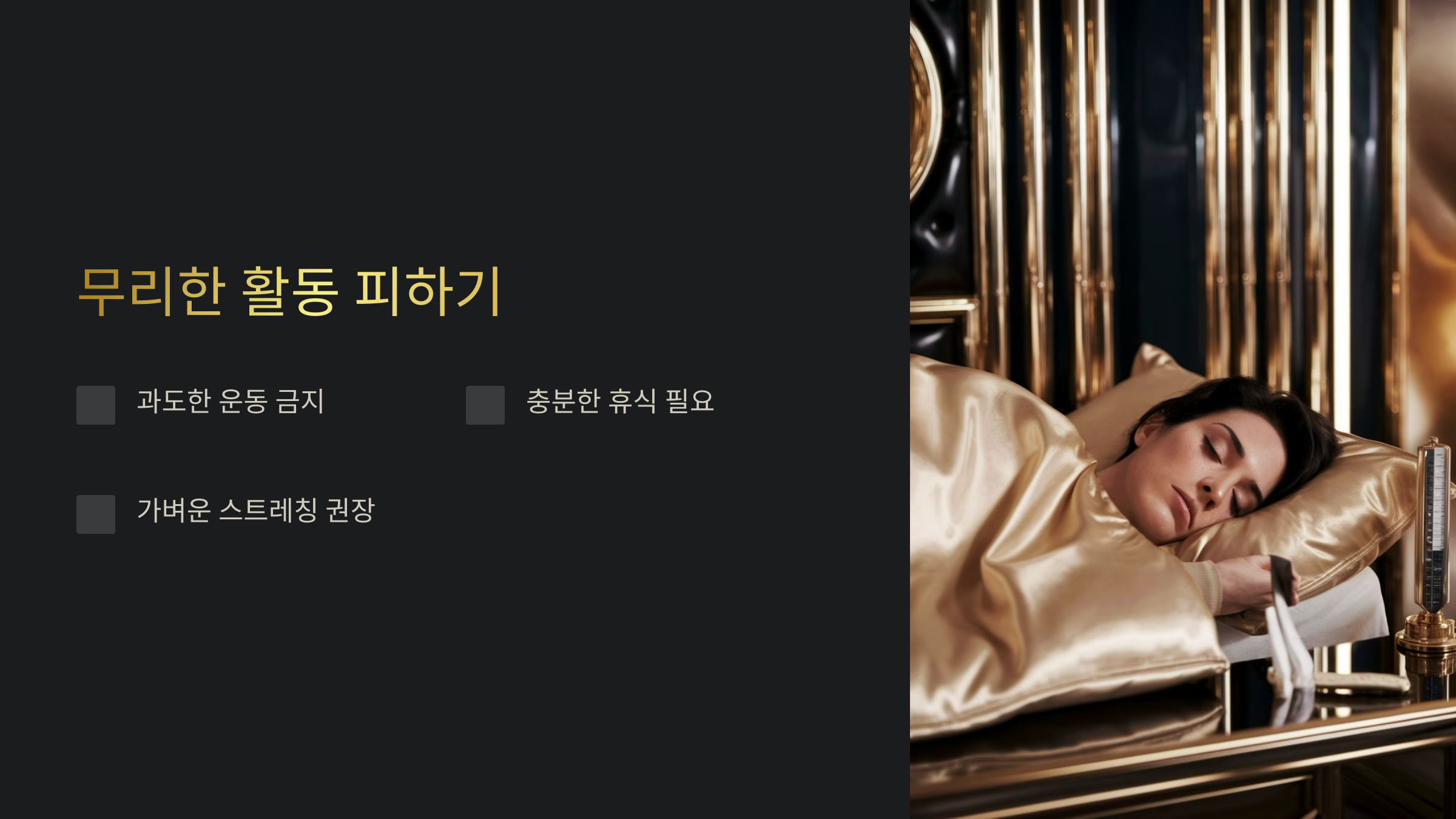 A2. 가벼운 스트레칭 정도는 괜찮지만, 무리한 운동은 피해야 해요.