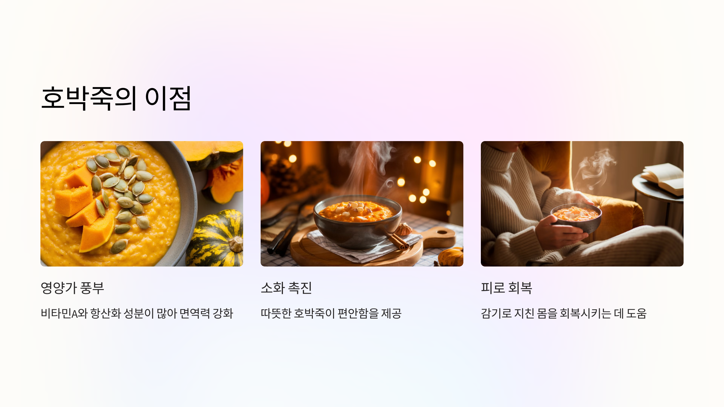 호박에는 비타민A와 항산화 성분이 풍부하여 감기로 지친 몸을 회복시키는 데 도움이 됩니다. 따뜻한 호박죽은 소화도 잘되어 편안함을 줘요.