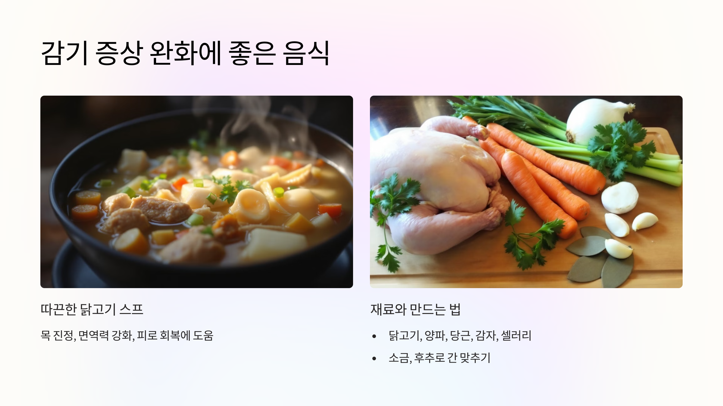 닭고기 스프는 감기 증상을 완화하는 데 가장 추천되는 음식 중 하나입니다. 따뜻한 국물은 목의 통증을 완화하고, 닭고기의 단백질은 면역력을 강화합니다.