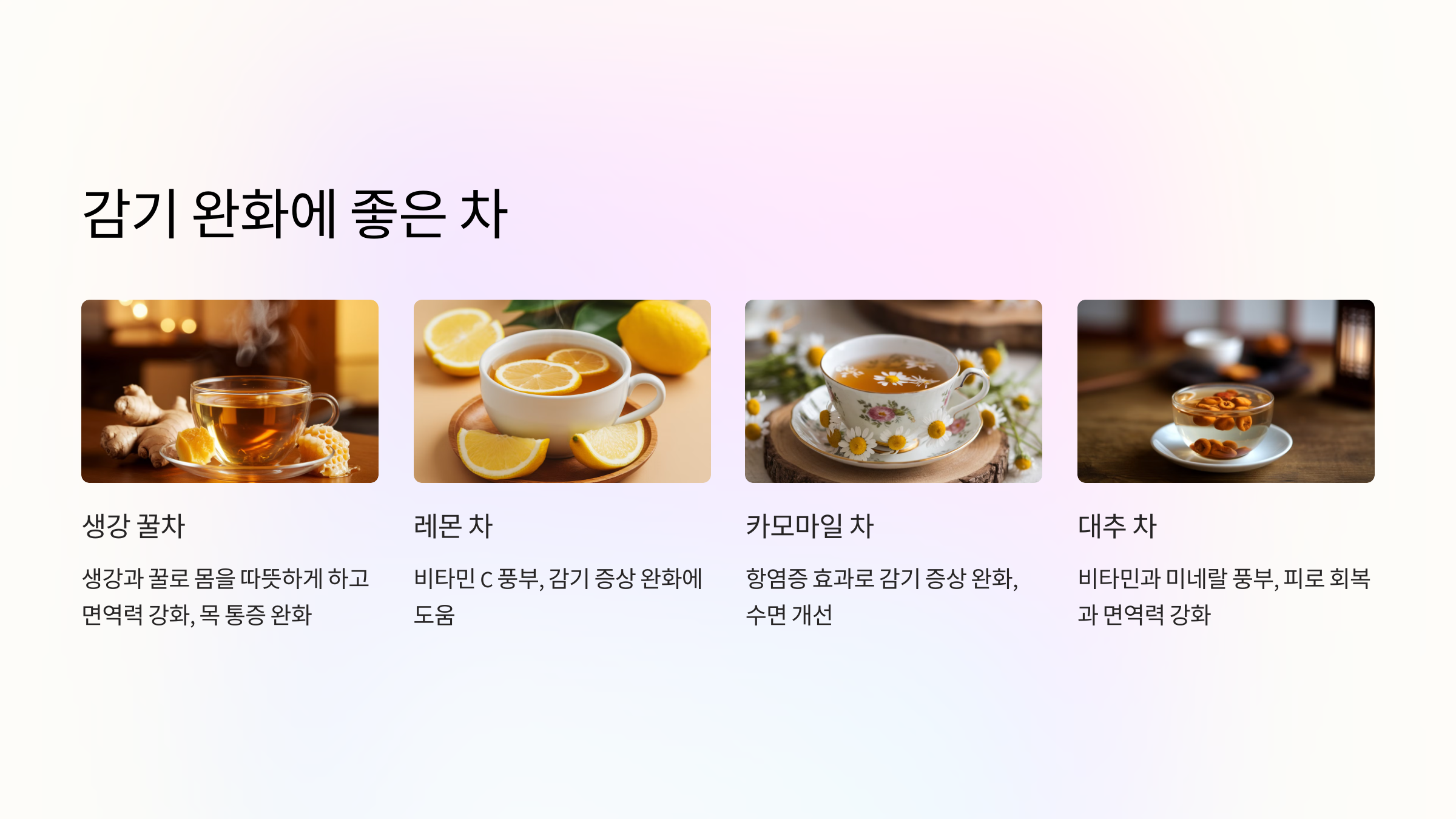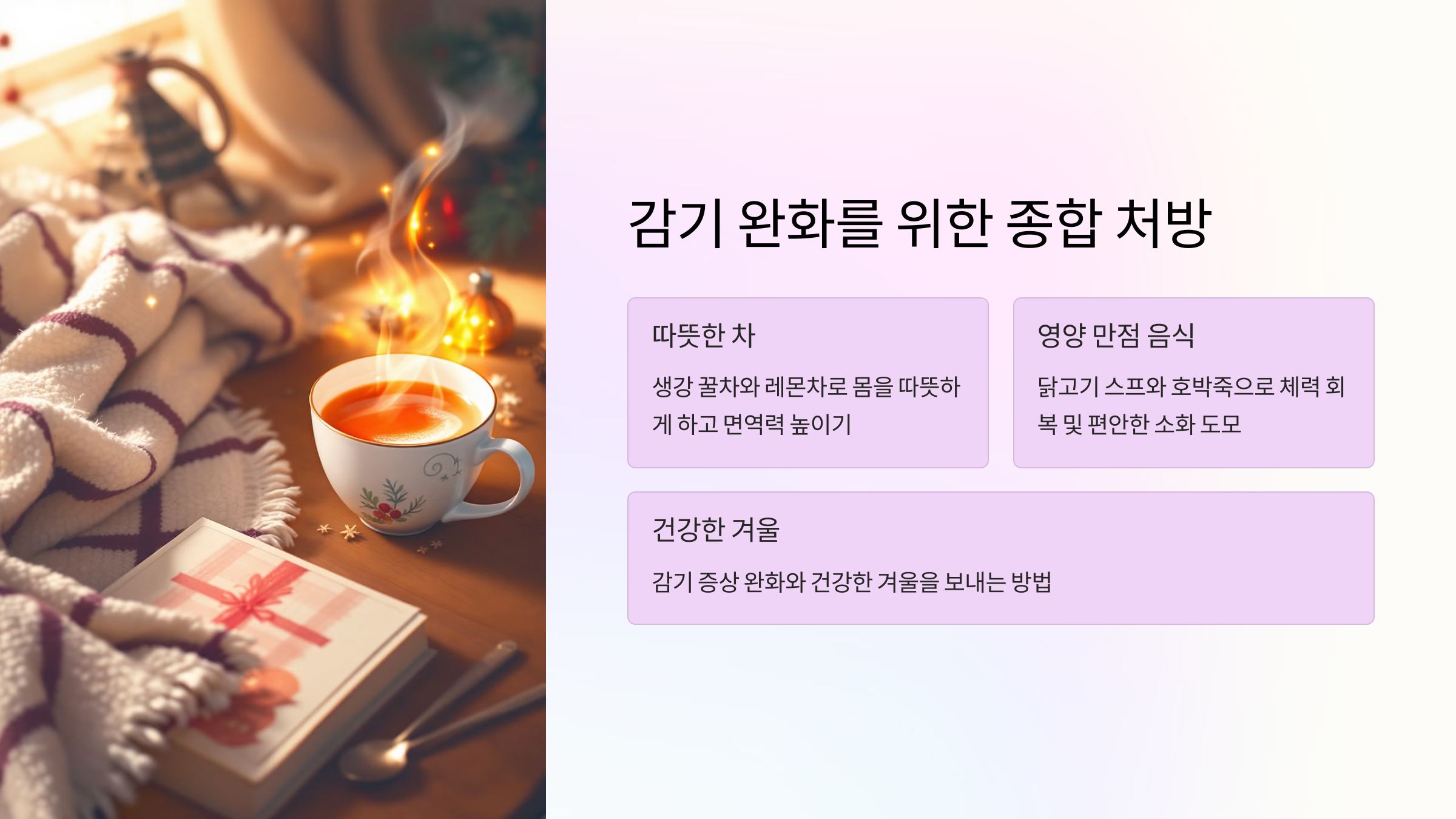이 글에서 소개한 차와 음식을 활용해 감기 증상을 효과적으로 완화하고, 건강한 겨울을 보내시길 바랍니다. 😊
