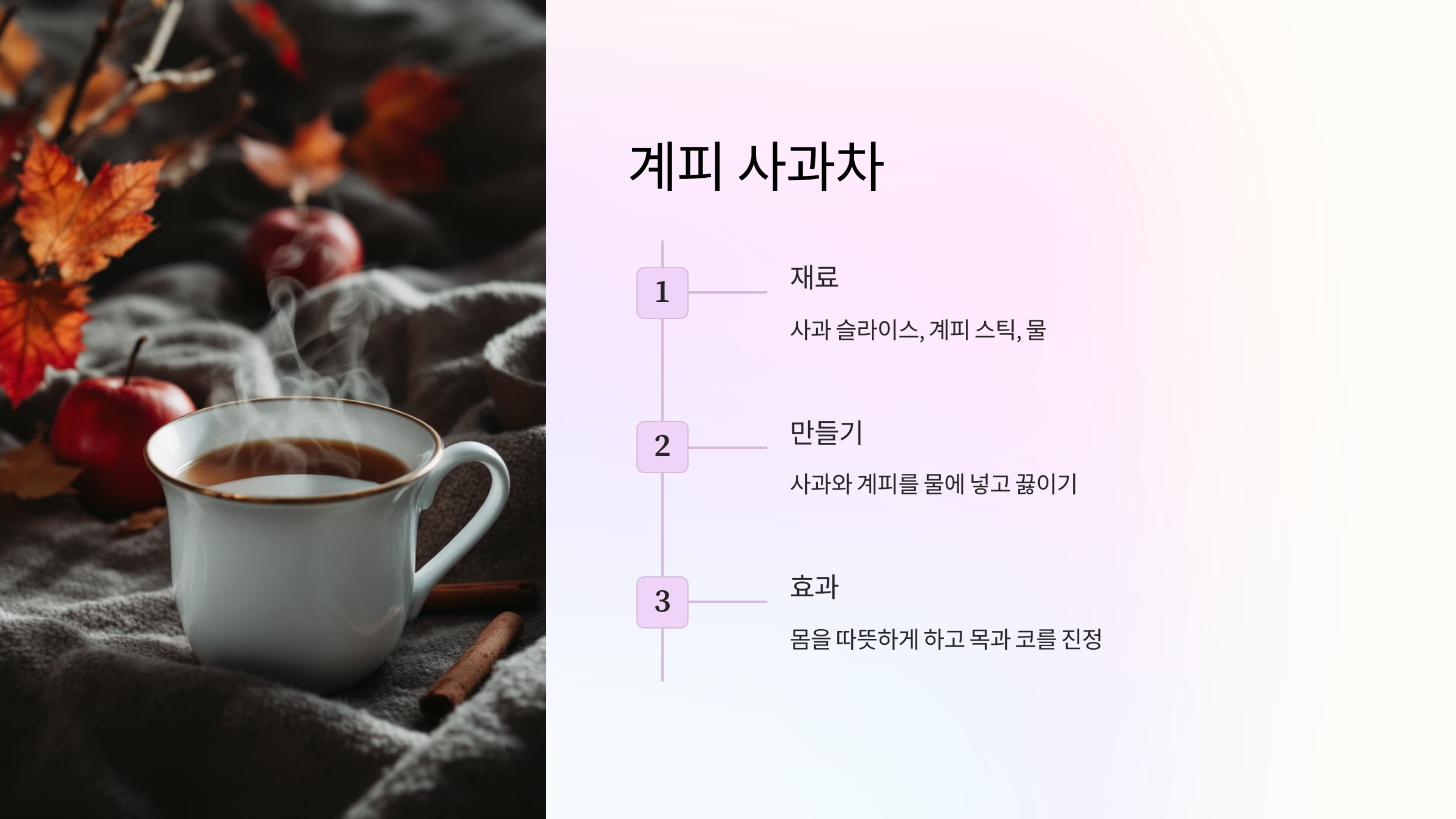 계피는 혈액순환을 도와 몸을 따뜻하게 하고, 사과는 풍부한 비타민으로 면역력을 높여줍니다.