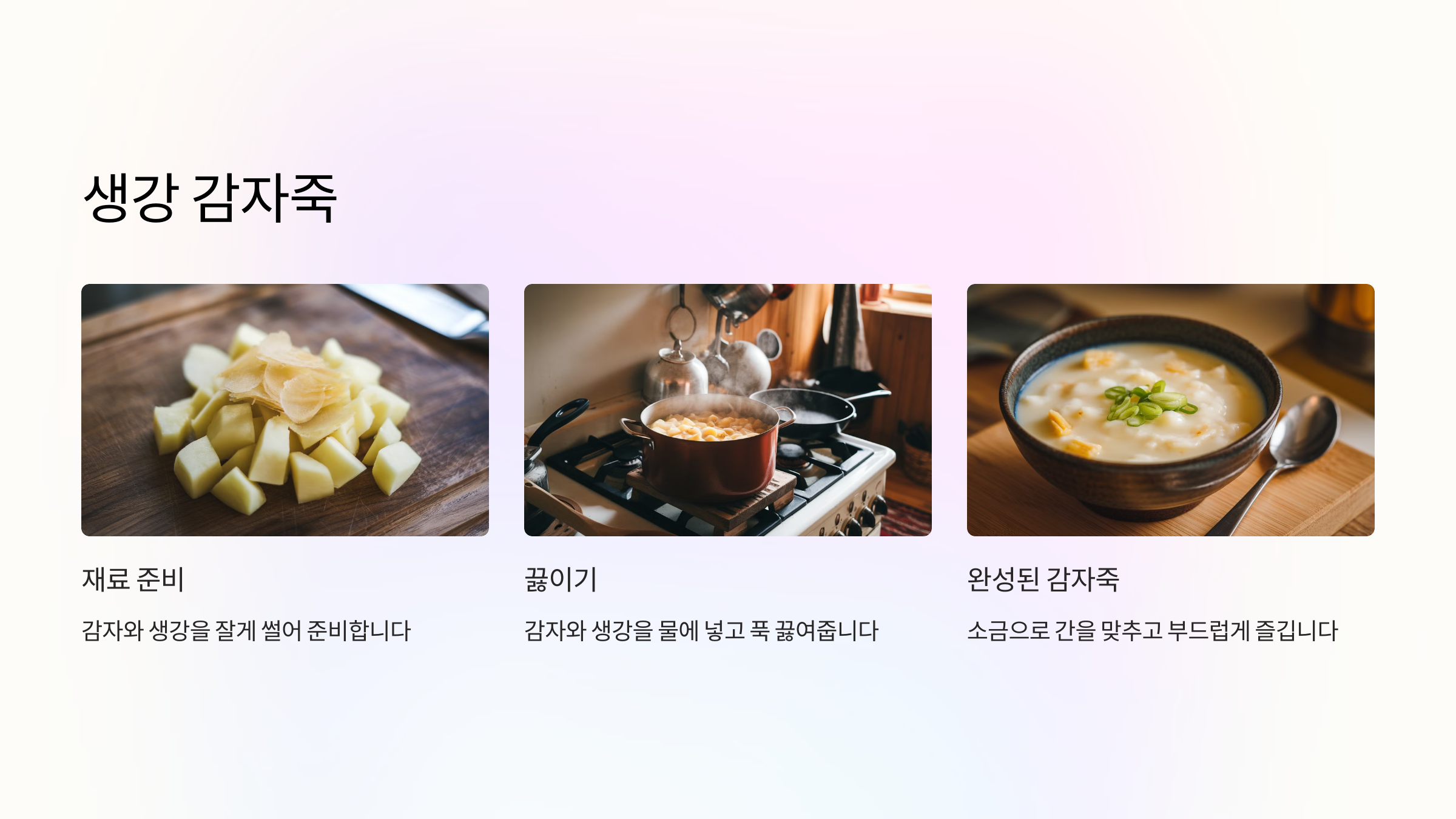 생강은 몸을 따뜻하게 하고 염증을 완화하며, 감자는 포만감과 에너지를 줍니다.