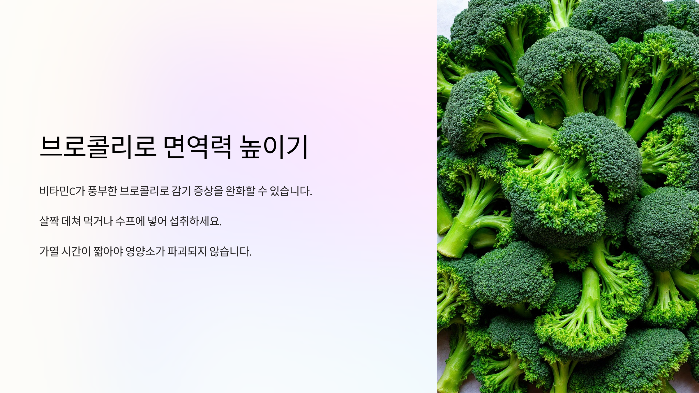 비타민C가 풍부한 브로콜리는 면역력을 높이고 감기 증상 완화에 효과적입니다. 살짝 데쳐 먹거나 수프에 넣어 활용해 보세요.