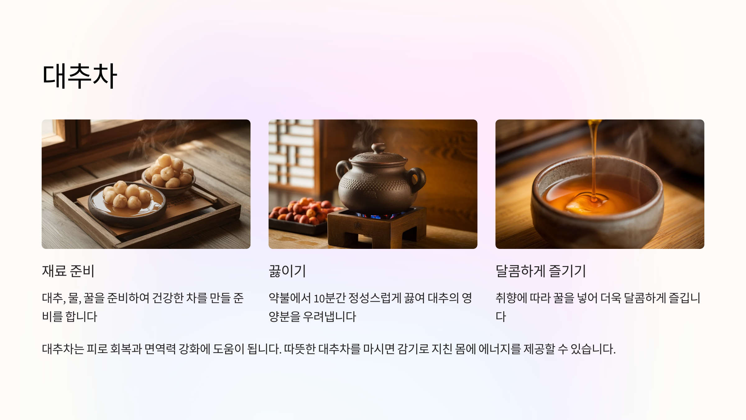대추는 피로 회복과 면역력 강화에 탁월한 음식입니다. 따뜻한 대추차는 몸을 데우고 감기로 지친 몸에 에너지를 제공합니다.