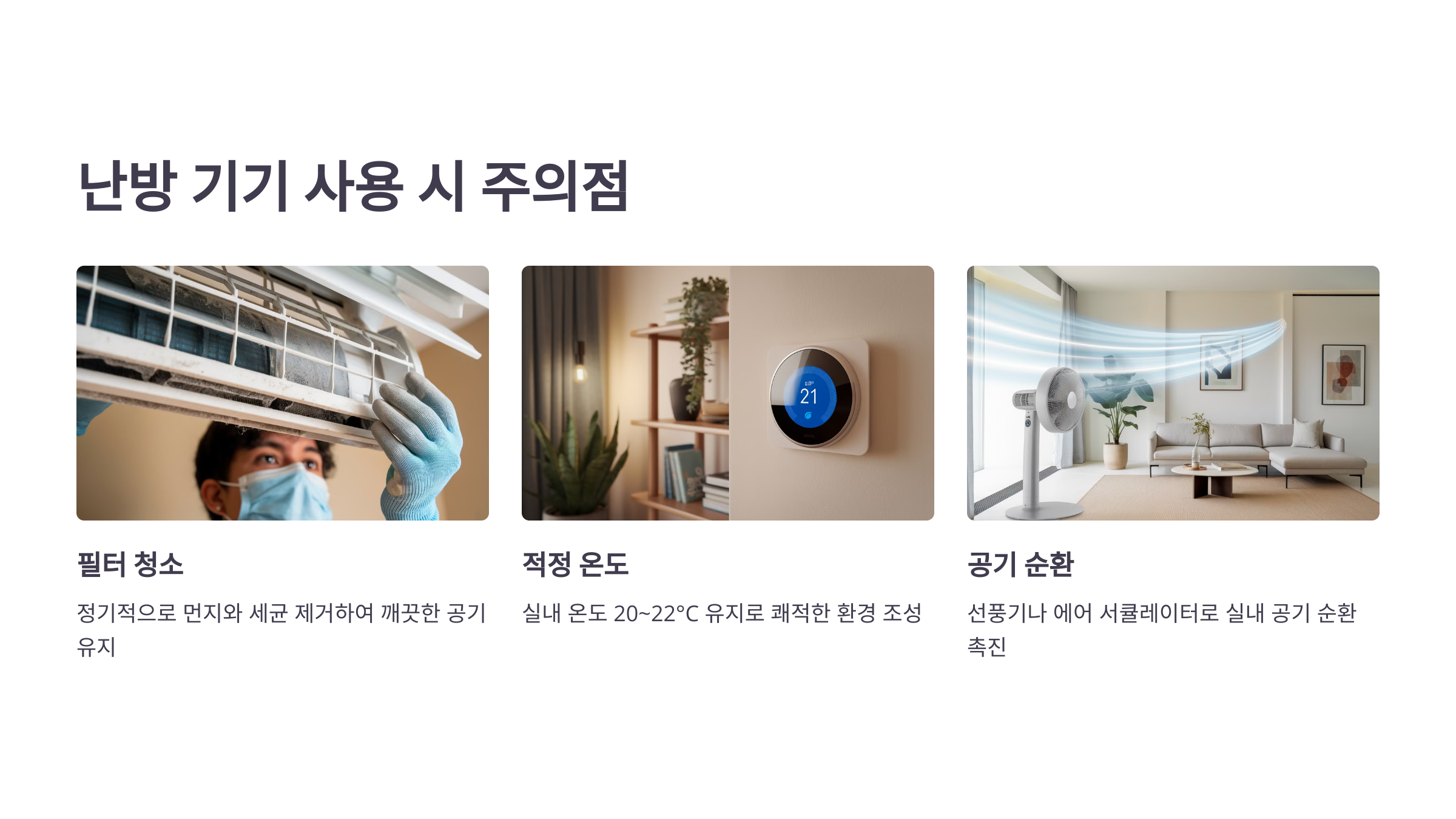 - 난방 기기 관리: 난방기 필터를 정기적으로 청소하여 먼지와 세균을 제거하세요.