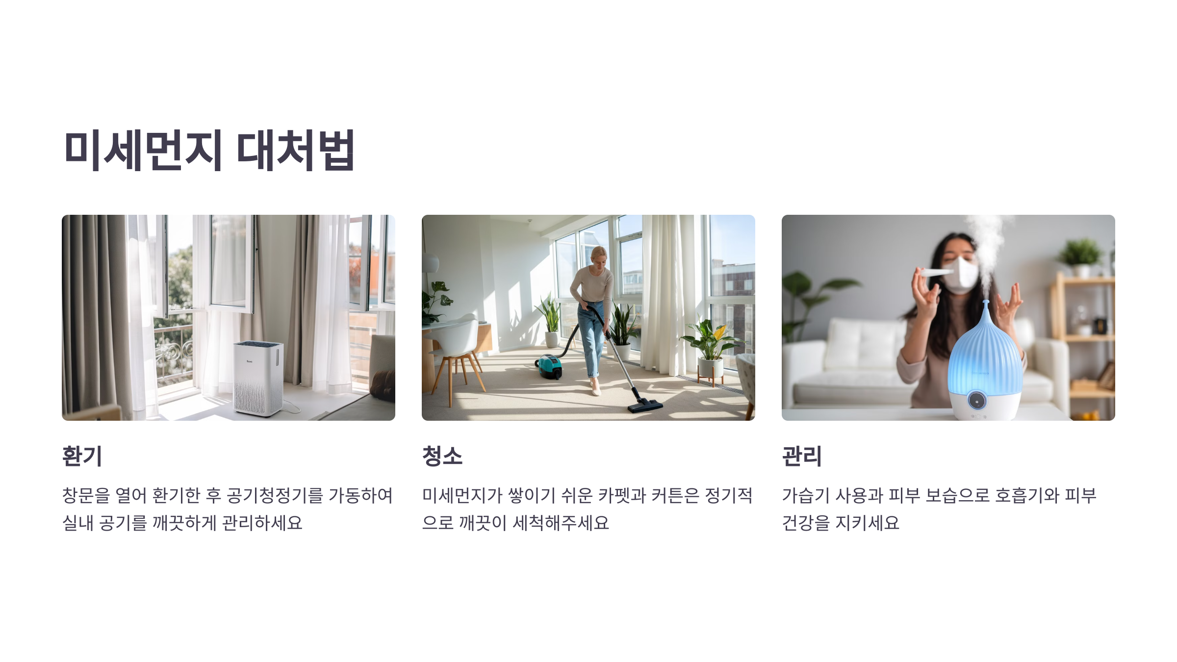 ✅ Tip: 미세먼지가 심한 날에는 실내 활동 시에도 창문 틈새를 밀봉하는 것이 좋습니다.