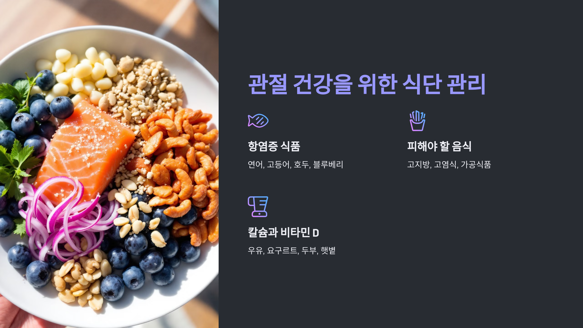 염증을 줄이고 관절을 보호하는 음식들을 꾸준히 섭취하세요.