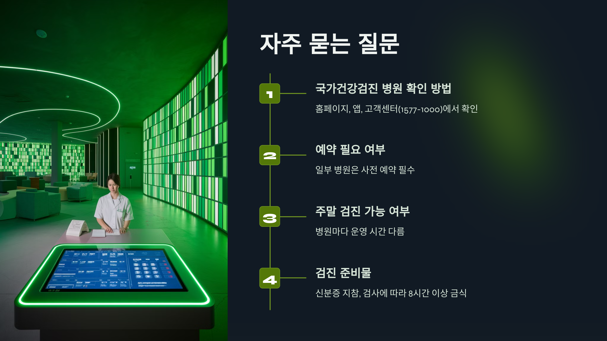 - 문의 내용: 검진 대상 여부, 가까운 병원 안내, 검진 예약 방법