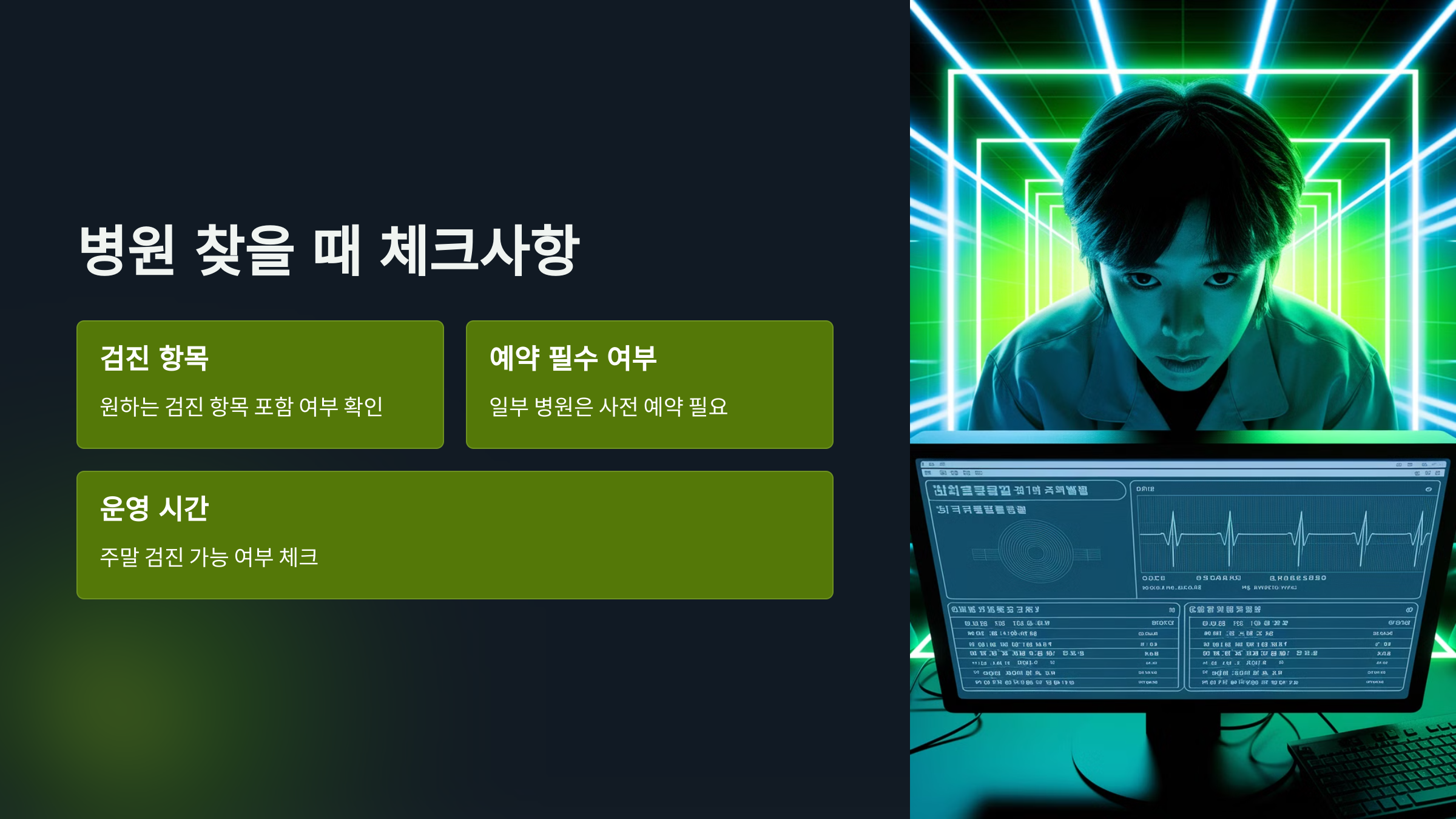 - 검진 항목: 원하는 검진(일반검진, 암검진 등)이 가능한 병원인지 확인!