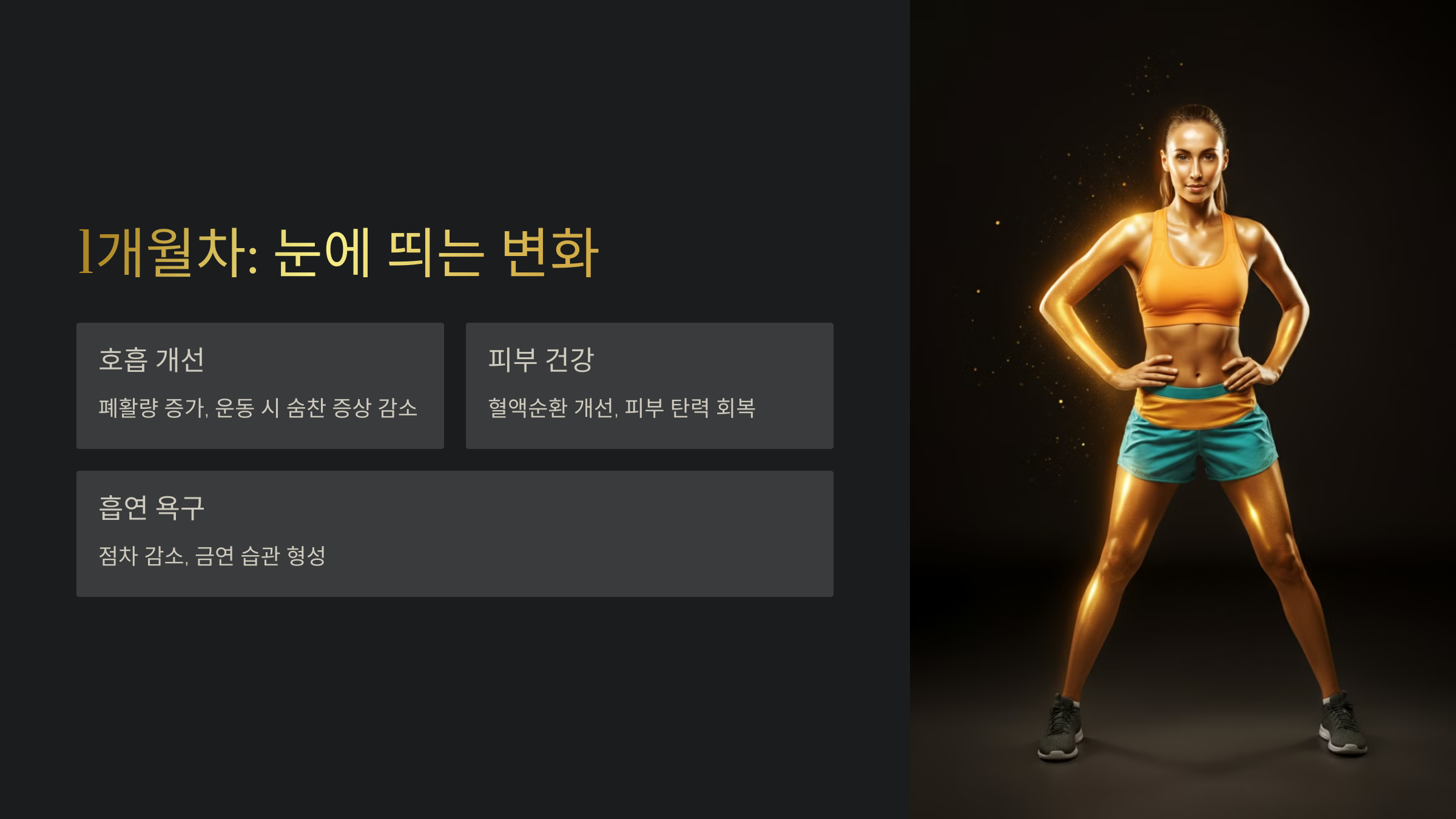 금연 1개월차가 되면, 호흡이 눈에 띄게 좋아져요. 폐활량이 증가해 계단을 오르거나 가벼운 운동을 할 때 숨이 덜 차는 것을 느낄 수 있어요. 이 시점부터 신체적 피로도가 줄어들고, 에너지가 더 많아진 것처럼 느껴지기도 해요.