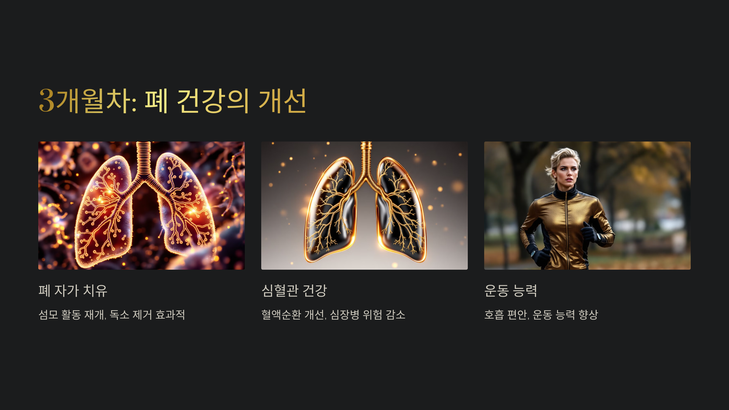 금연 3개월차에는 폐의 자가 치유 능력이 눈에 띄게 향상돼요. 섬모라는 폐 조직이 다시 활동을 시작하면서 폐에 남아 있는 독소를 점점 더 효과적으로 제거하게 돼요. 호흡이 훨씬 편안해지고, 운동 능력도 눈에 띄게 개선돼요.