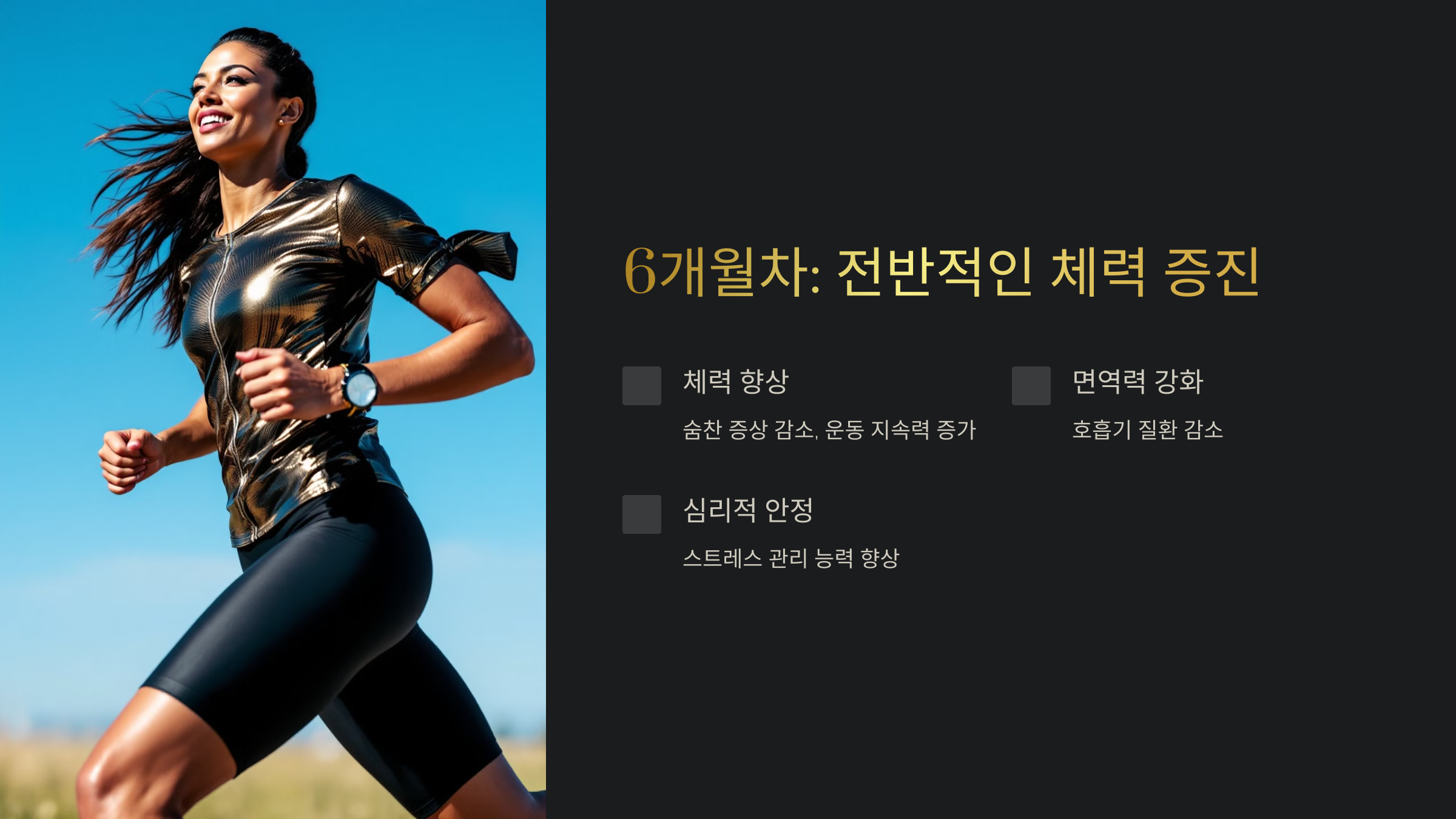 기침, 가래와 같은 증상이 현저히 줄어들고, 폐 기능이 정상 수준으로 회복되기 시작해요. 이 시기에 운동을 병행하면 더 빠른 회복 효과를 기대할 수 있답니다.