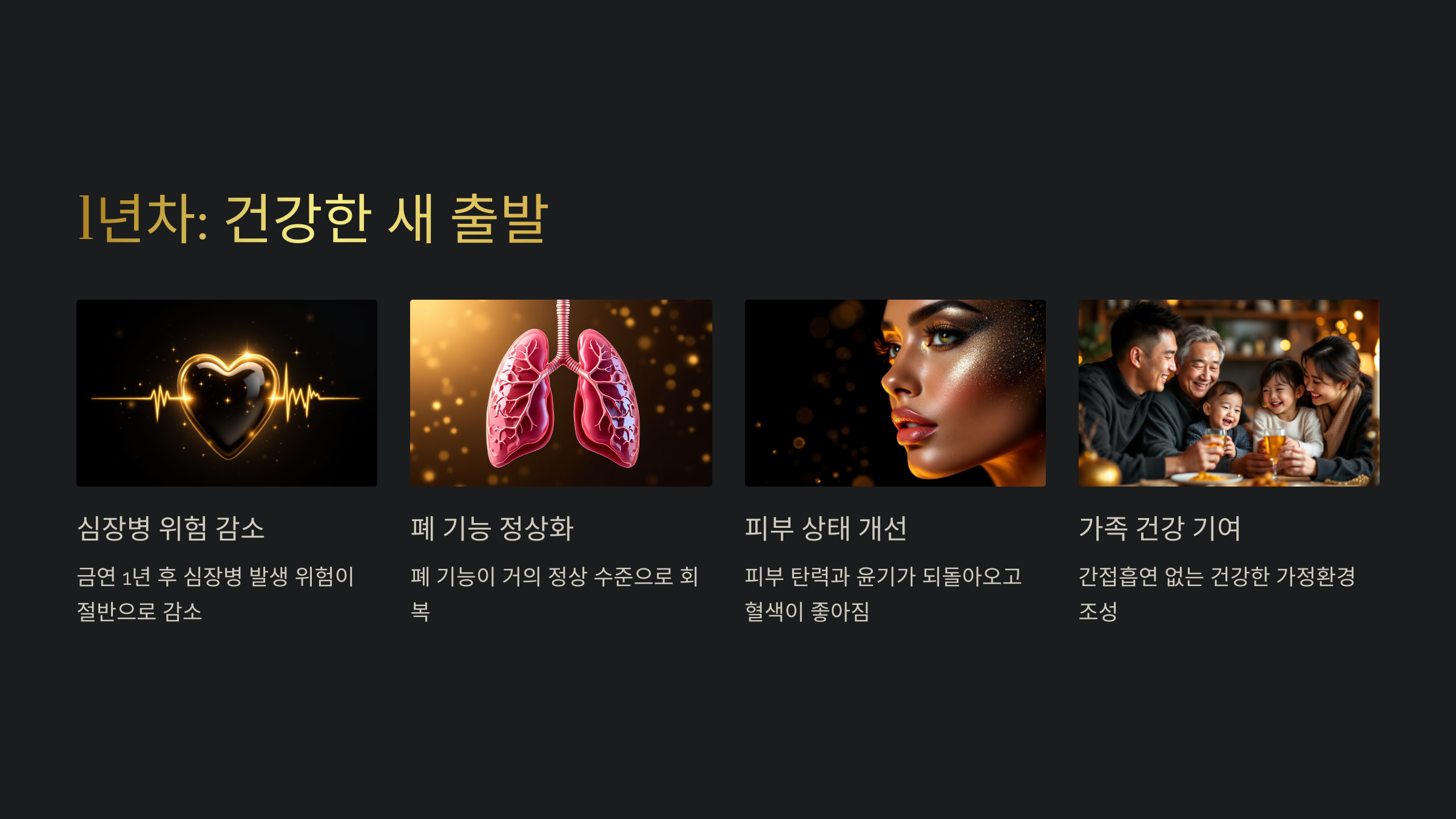 금연 1년이 되는 시점, 건강상 이점은 더욱 놀라워요. 심장병 위험이 흡연자에 비해 절반 이하로 줄어들고, 폐 기능이 정상에 가까운 상태로 회복돼요. 이는 금연이 가져다주는 장기적 이점 중 하나예요.