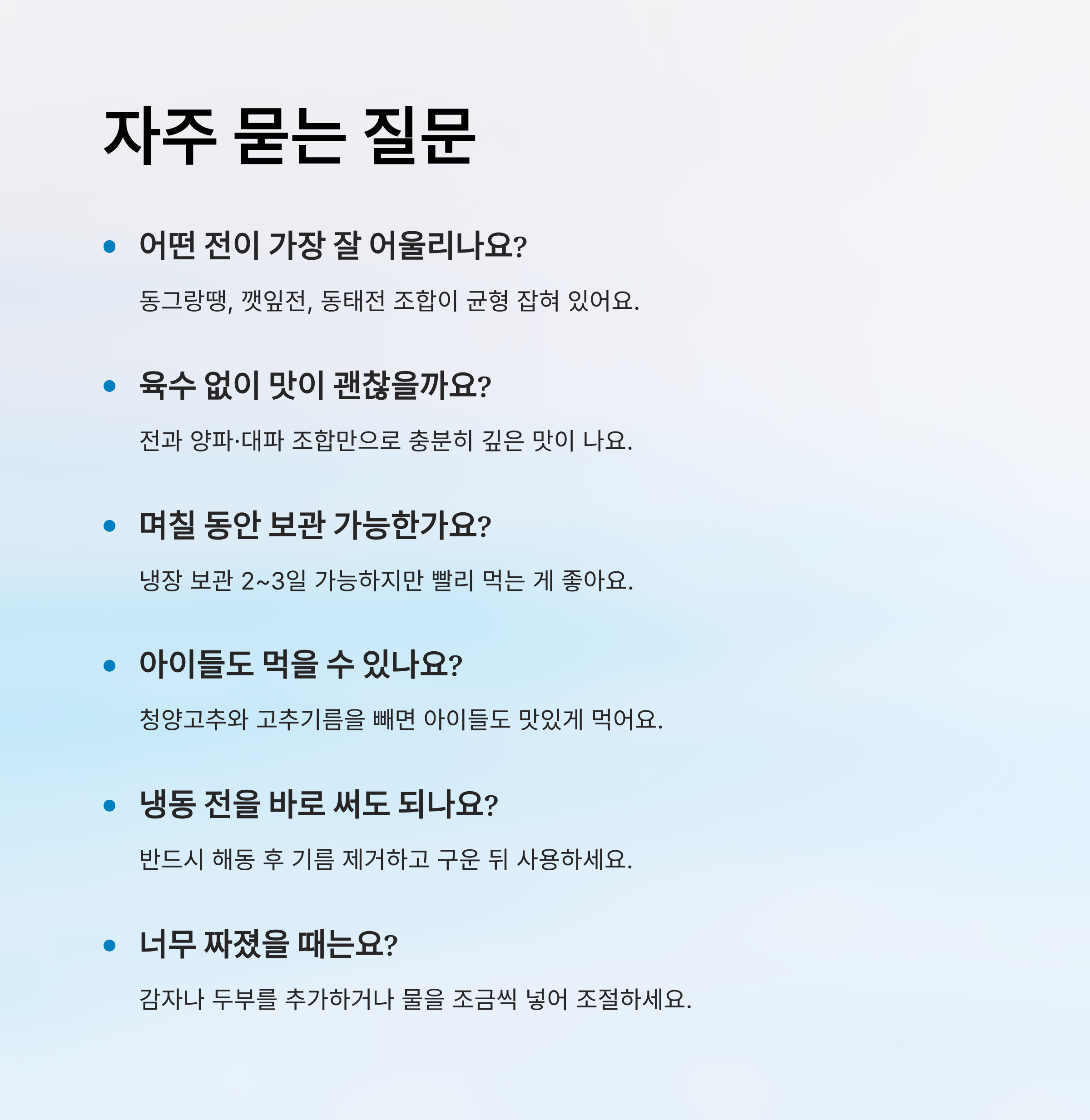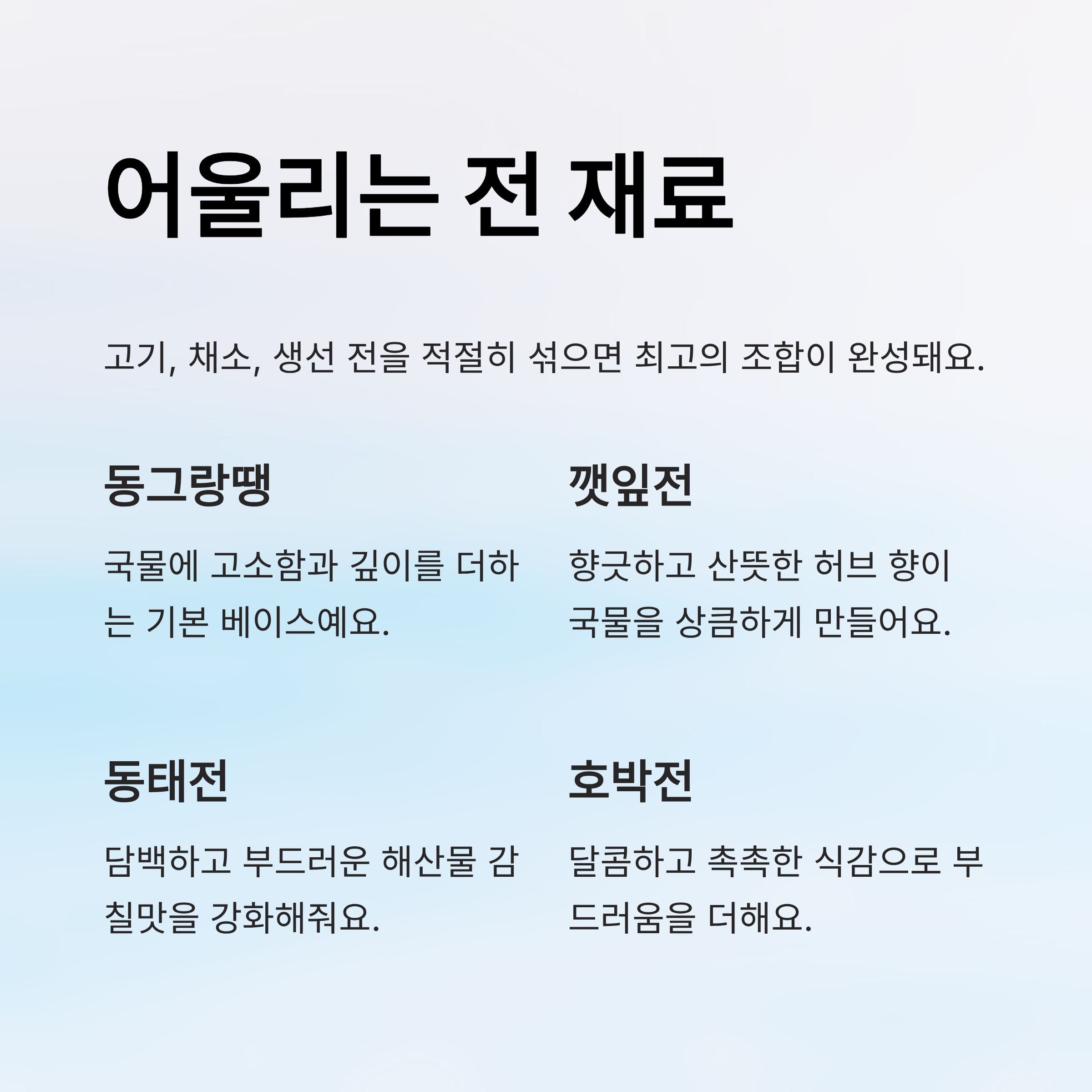 | 동태전 | 담백하고 부드러움 | 감칠맛 강화 | 해산물 풍미 강조 |
